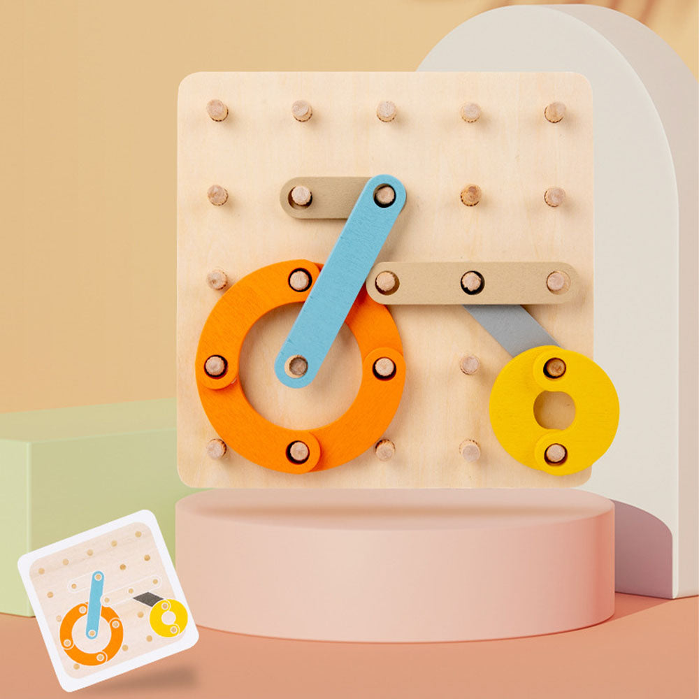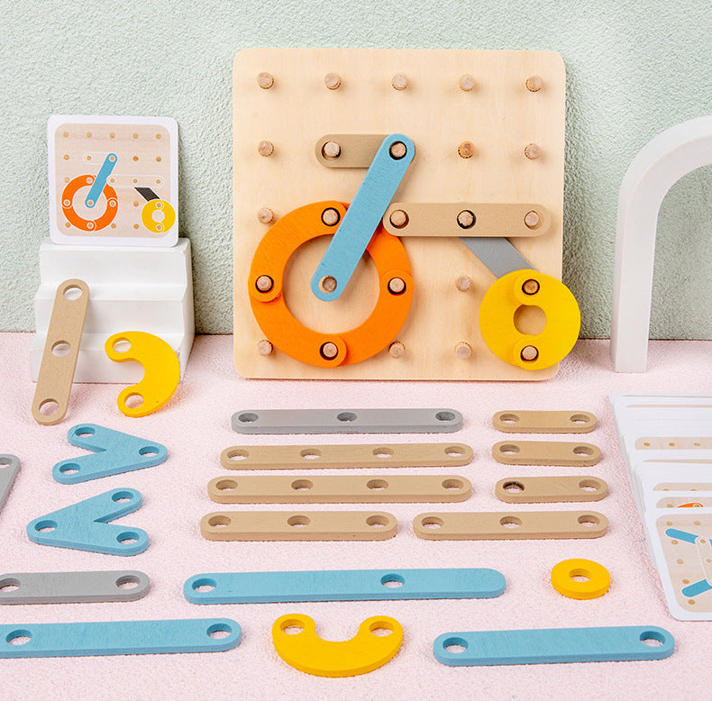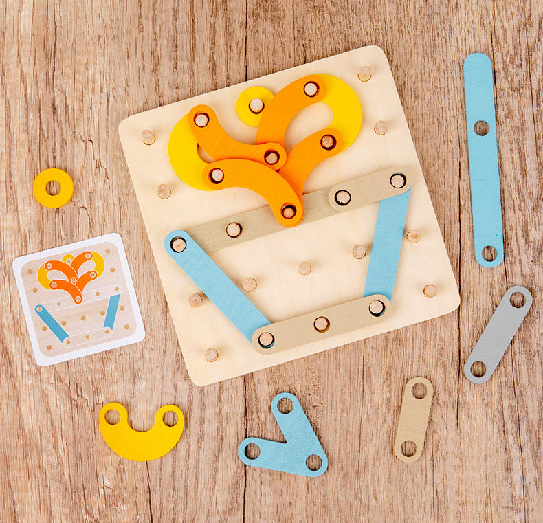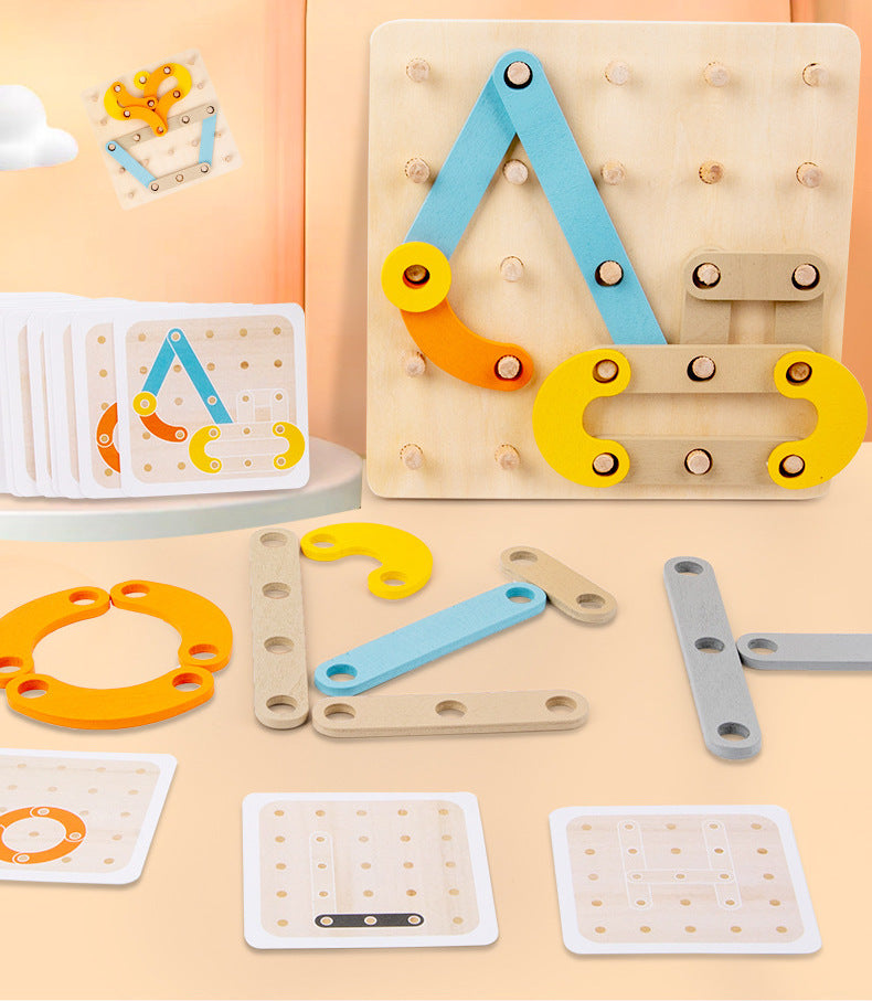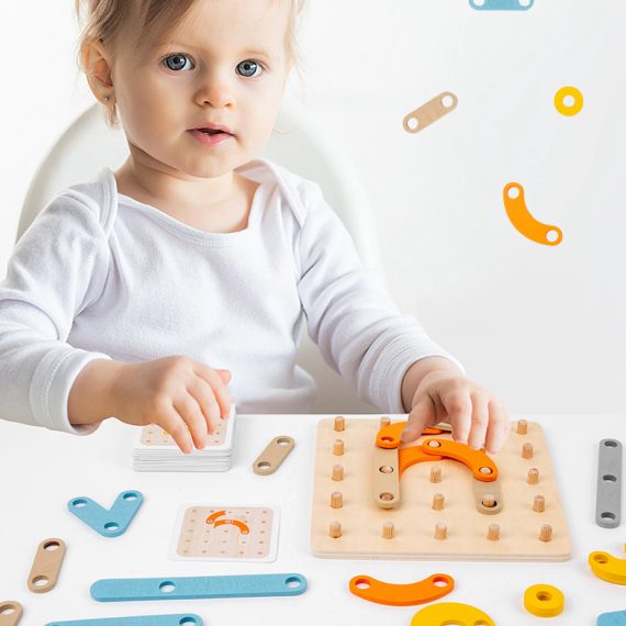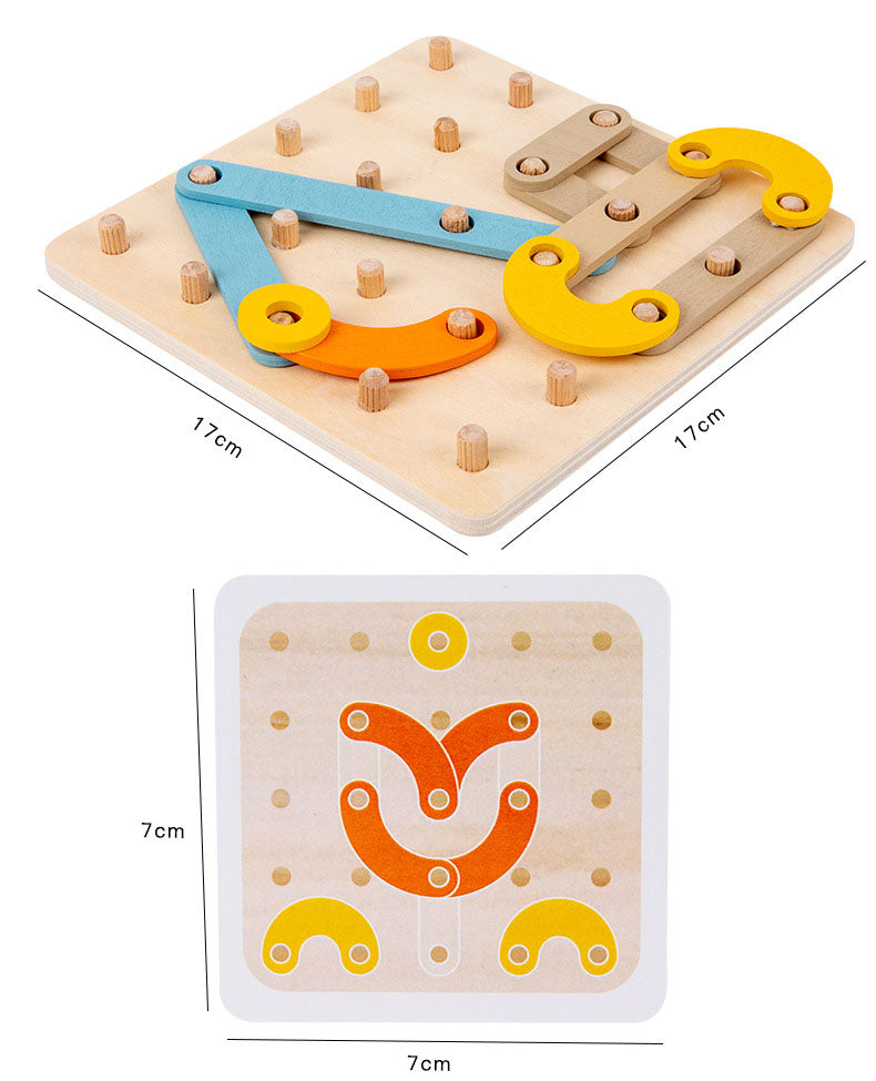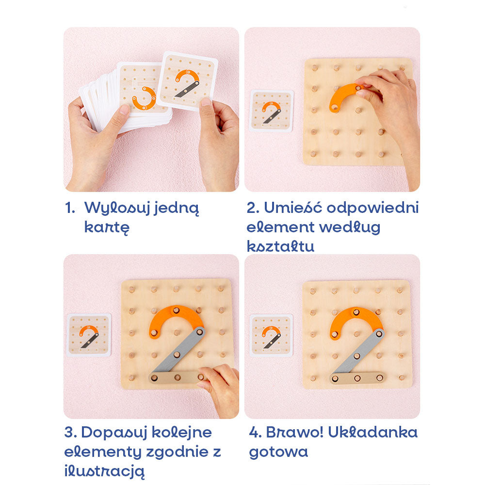 Ta kreatywna zabawka polega na odwzorowywaniu wzorów z kart przy użyciu drewnianych elementów o różnych kształtach i długościach. Dziecko umieszcza części na planszy z bolcami tak, by ułożyć obrazek zgodny z kartą – mogą to być litery, cyfry, maszyny, zwierzęta i wiele więcej! Idealna zabawka w duchu Montessori – do przedszkola, szkoły i domu. Solidne wykonanie z drewna i mnogość wzorów zapewniają długą i rozwijającą zabawę.