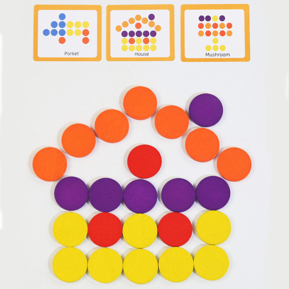 Dziecko układa kolorowe krążki zgodnie z ilustracjami lub tworzy własne kompozycje, korzystając z bogatej palety barw i kształtów. To prosta i wciągająca zabawa, która nie nudzi się nawet po wielu godzinach.