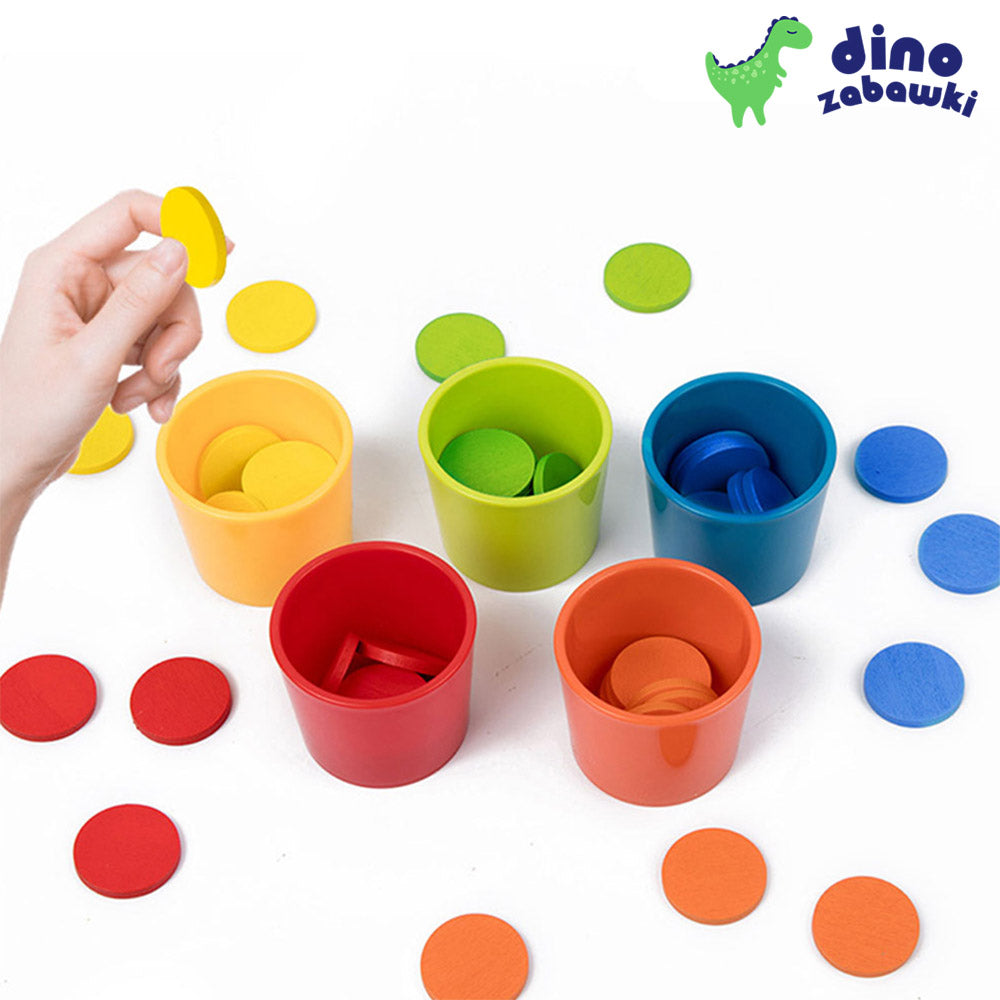 Zadaniem dziecka jest dopasowanie krążków do kubeczków w tych samych kolorach. To świetna forma zabawy, która polega na sortowaniu elementów według barw – wystarczy uważnie obserwować i wkładać krążki do odpowiednich pojemników.