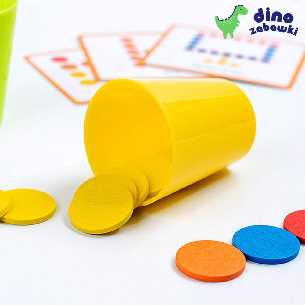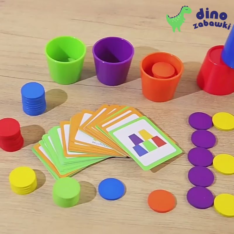 CupGame to edukacyjna zabawka wspierająca rozwój dziecka poprzez zabawę kolorami i kształtami. Zestaw zawiera kolorowe kubeczki, krążki i karty z wzorami. Dziecko dopasowuje kolory i odtwarza układy według kart lub własnej wyobraźni.