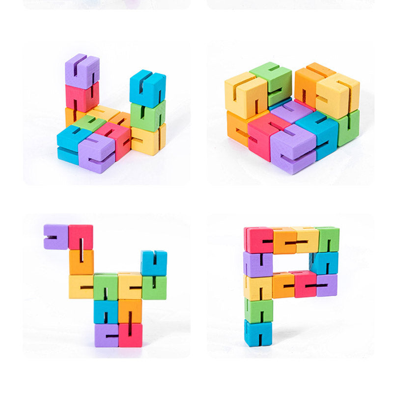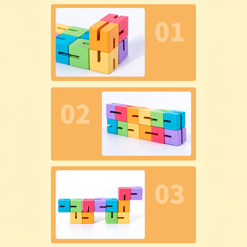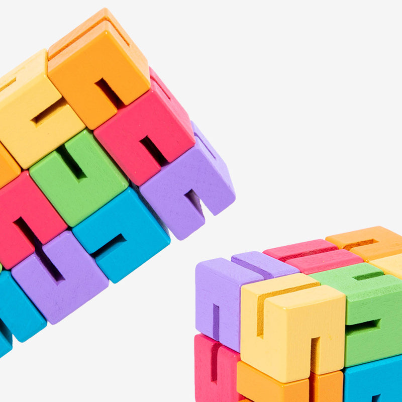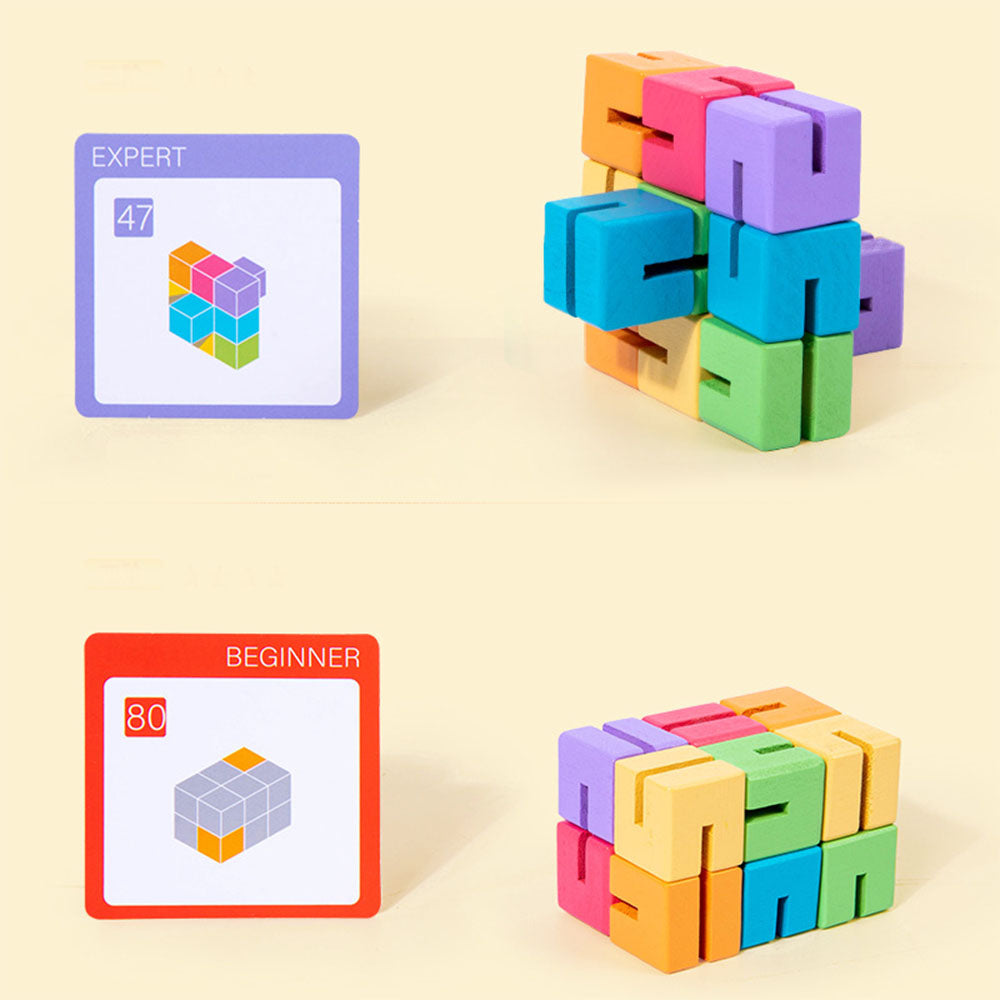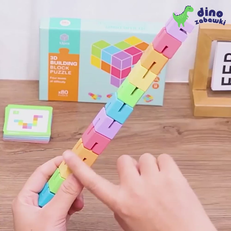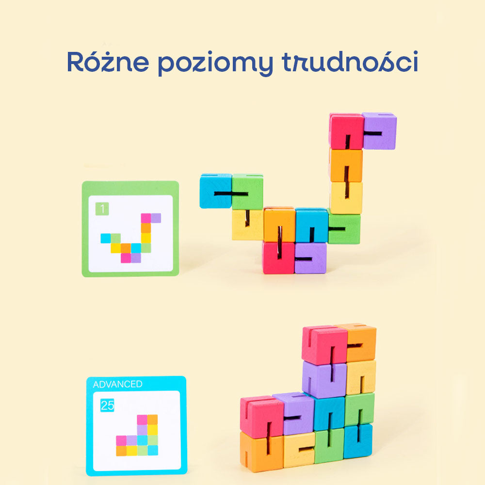 Edukacyjna układanka 3D to zestaw kolorowych, drewnianych klocków nawleczonych na elastyczną linkę, które można obracać i przekładać, tworząc przestrzenne kształty. Gracz wybiera kartę i stara się odtworzyć przedstawiony na niej wzór, manipulując klockami jak łamigłówką.