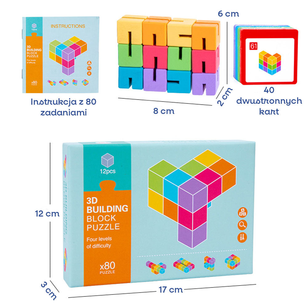 Zestaw zawiera 12 kolorowych, drewnianych klocków o łącznych wymiarach 8 x 6 x 2 cm, aż 40 dwustronnych kart z zadaniami oraz instrukcję z kompletem 80 wyzwań do ułożenia. Całość zapakowana jest w estetyczne, poręczne pudełko o wymiarach 17 x 12 x 3 cm, które świetnie sprawdzi się zarówno w domu, jak i w podróży. Przemyślana konstrukcja i różne poziomy trudności sprawiają, że zabawka rośnie razem z dzieckiem i przez długi czas rozwija jego wyobraźnię przestrzenną i logiczne myślenie. Zabawka powyżej 3 roku życia.
