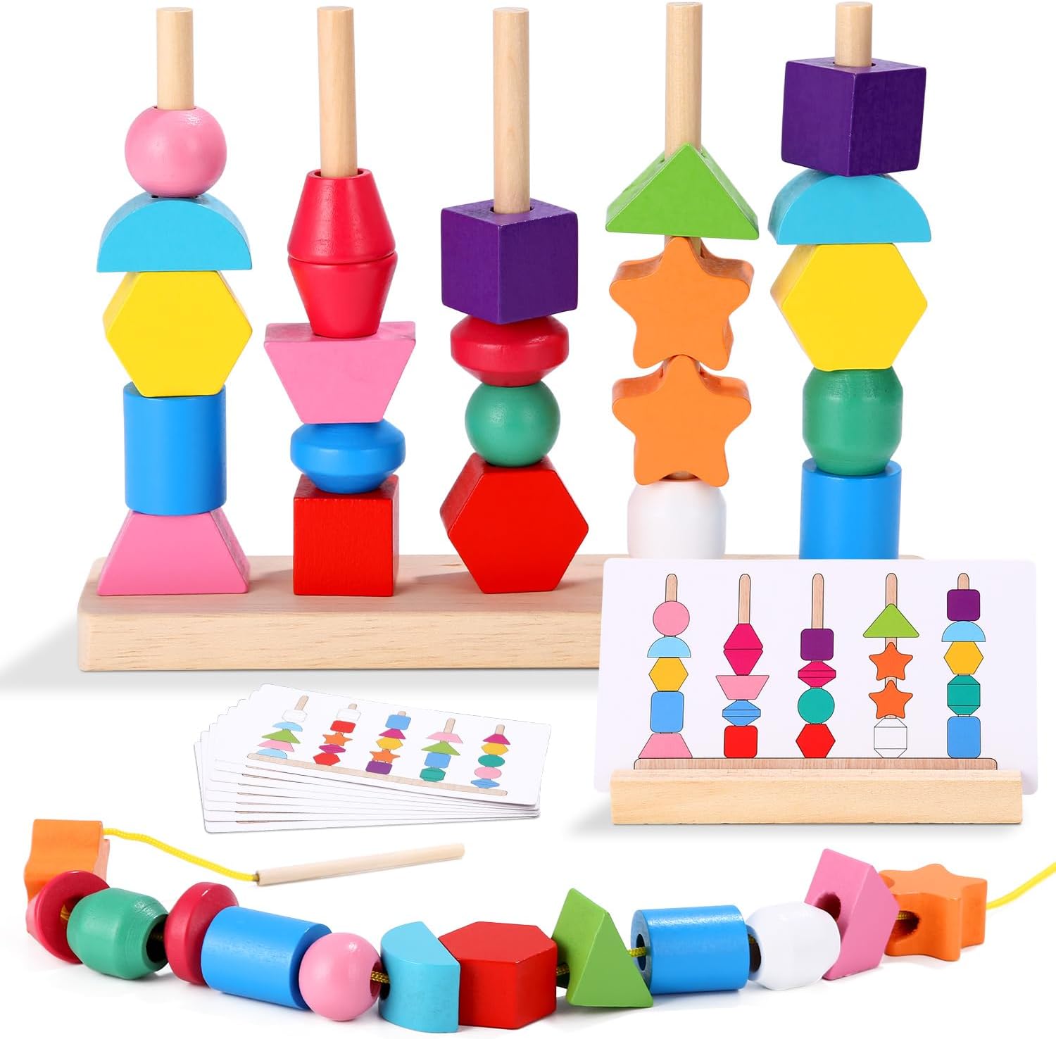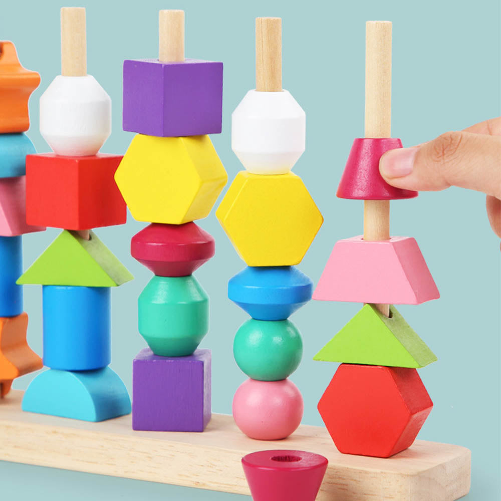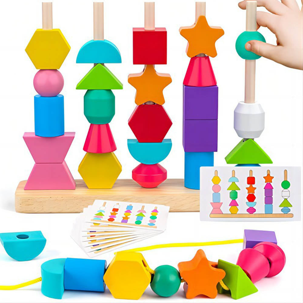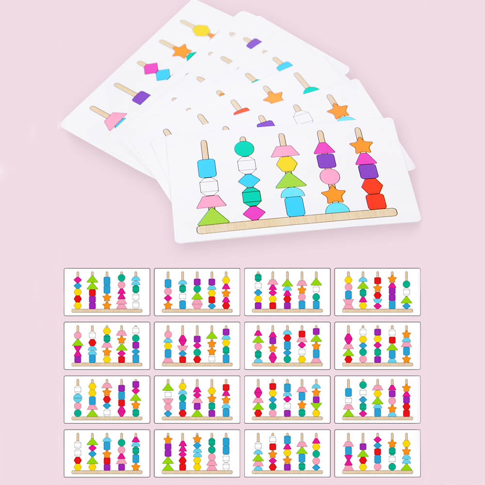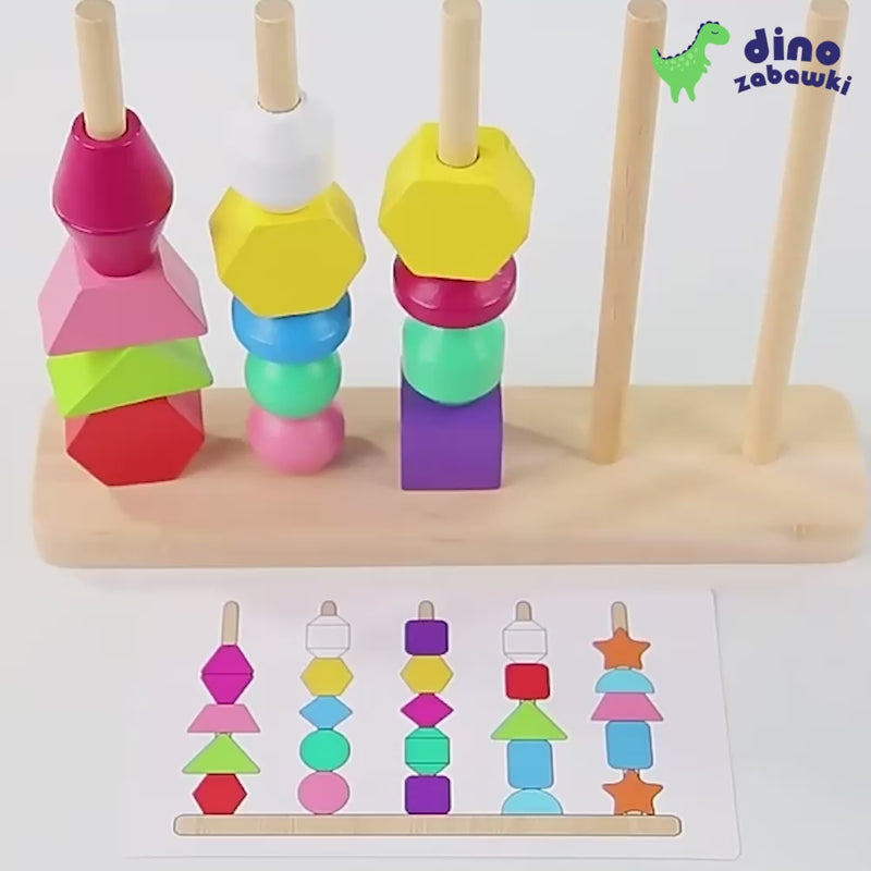 Ta wielofunkcyjna zabawka edukacyjna świetnie rozwija motorykę, logiczne myślenie oraz rozpoznawanie kształtów i kolorów już od najmłodszych lat. Dziecko układa kolorowe klocki o różnych kształtach – gwiazdki, kule, sześciany, półkola, sześciokąty i inne – na drewnianych patyczkach według kart pracy lub tworzy własne kompozycje.