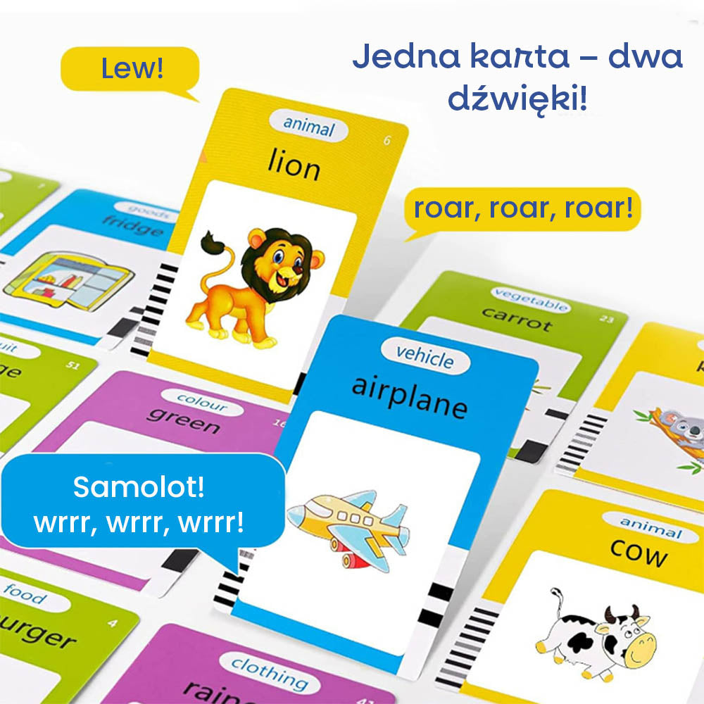 Z tym zestawem Twoje dziecko ma szansę poznać aż 224 różne słowa – każda karta ma dwie strony z ilustracjami i wyrazami.