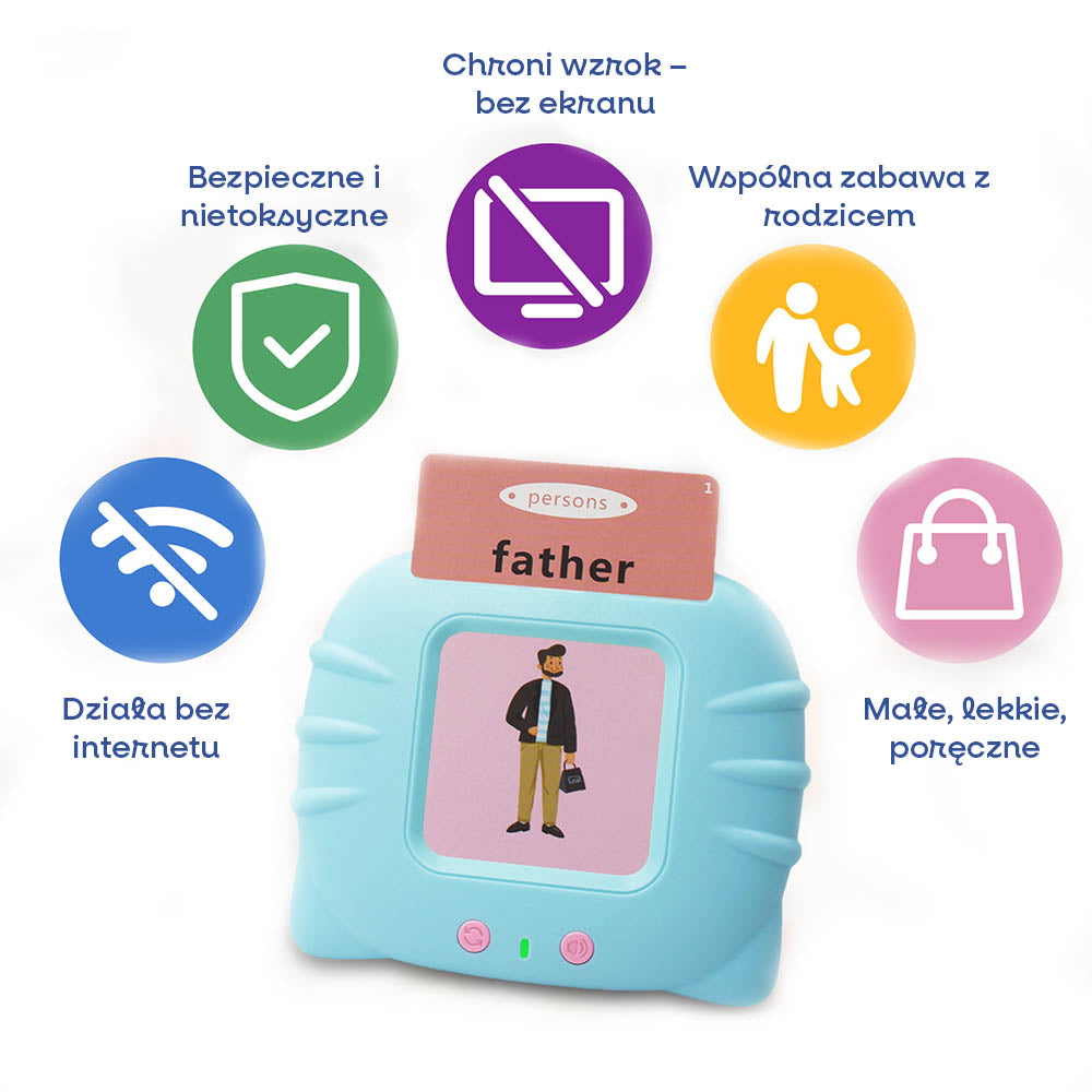 Rodzic może aktywnie towarzyszyć dziecku w odkrywaniu nowych słów, dźwięków i obrazków — zachęcać do powtarzania, zadawać pytania, rozmawiać o tym, co przedstawia karta. To nie tylko rozwija słownictwo, ale też buduje więź emocjonalną, wzmacnia komunikację i daje dziecku poczucie bezpieczeństwa.