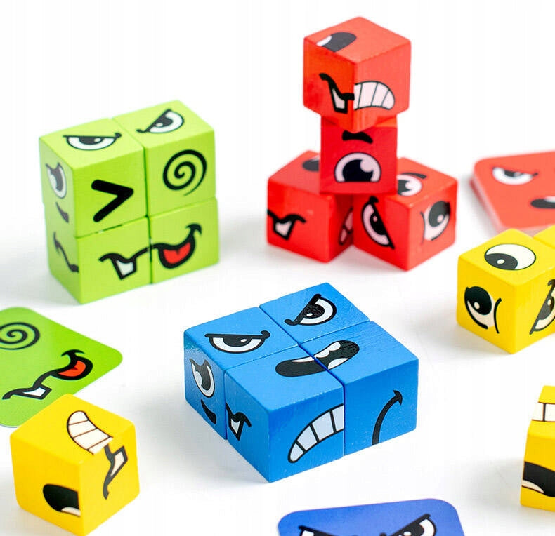 Zestaw zawiera 16 drewnianych kostek w 4 intensywnych kolorach: czerwonym, żółtym, zielonym i niebieskim. Każda kostka przedstawia różne elementy twarzy – oczy, brwi, usta – które można dowolnie łączyć, tworząc zabawne mimiki zgodne z kartami. Do zestawu dołączono również komplet kart z wzorami do odwzorowywania. Wszystkie elementy wykonane są z bezpiecznego, trwałego drewna i pokryte nietoksyczną farbą, dzięki czemu nadają się nawet dla młodszych dzieci. Gładkie krawędzie i solidne wykonanie gwarantują długą, bezpieczną zabawę pełną śmiechu i kreatywności.