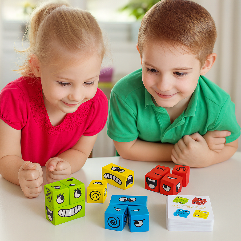 Układanka wspiera dzieci w nauce rozpoznawania i nazywania emocji, rozwijając przy tym inteligencję emocjonalną i empatię. Podczas dopasowywania elementów twarzy do wzorów na kartach dziecko ćwiczy koncentrację, logiczne myślenie oraz koordynację ręka-oko. Obracanie i dopasowywanie klocków wpływa także na rozwój małej motoryki i precyzji ruchów. To świetna forma nauki przez śmiech, kreatywność i radosną zabawę.