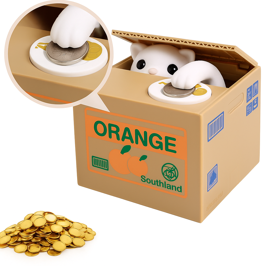 Kotek – ukryty w pudełku, wysuwa łapkę i sprytnie „kradnie” monetę do środka.