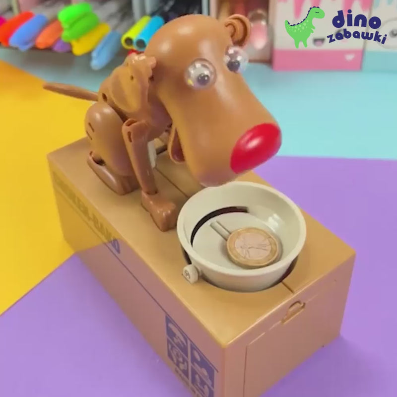 Piesek – pochyla się nad miseczką i „zjada” monety, jakby naprawdę był głodny.