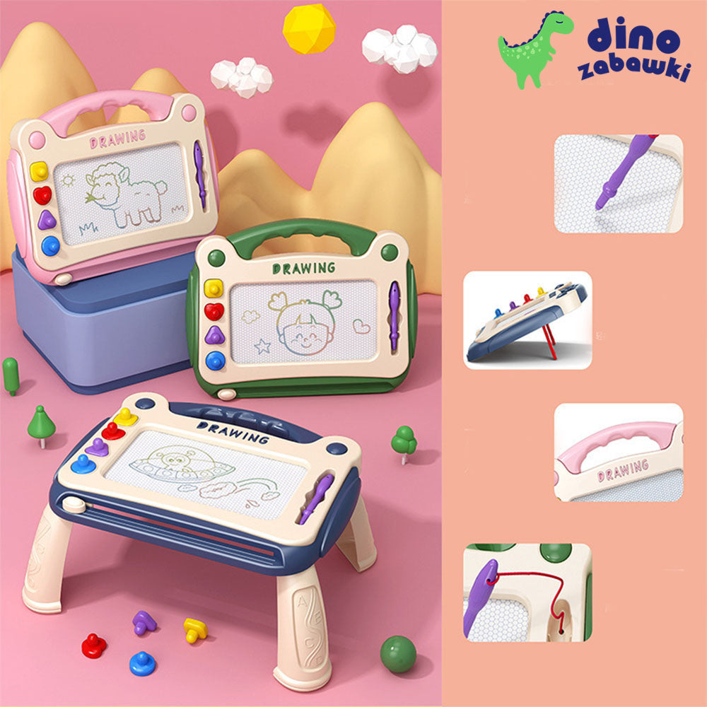 Tablica jest lekka, wygodna w przenoszeniu, a wersja z nóżkami może służyć jako stolik do rysowania. To świetna zabawa, która wspiera rozwój motoryki, koordynacji oraz pierwsze kroki w pisaniu i rysowaniu.