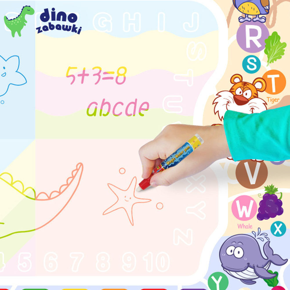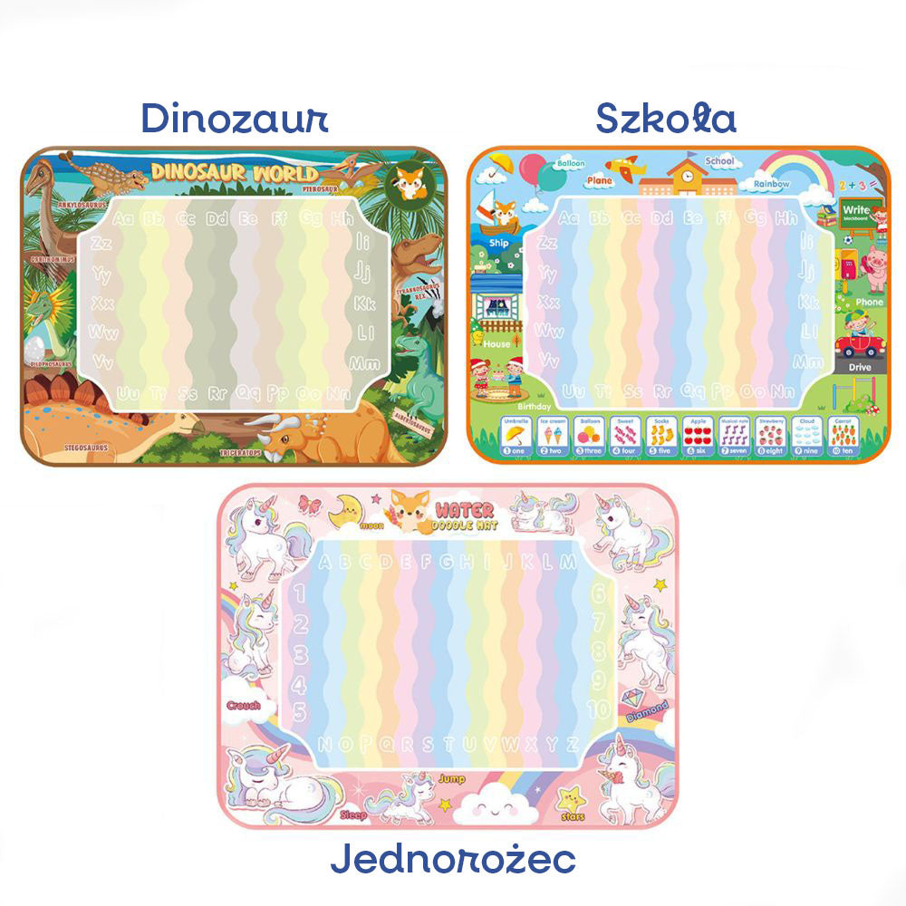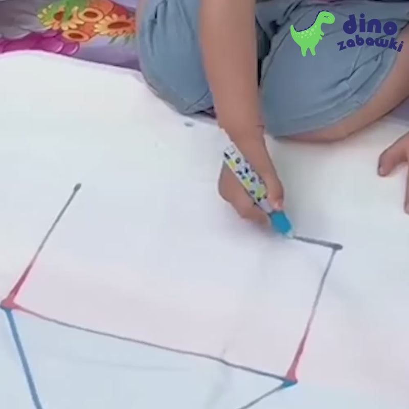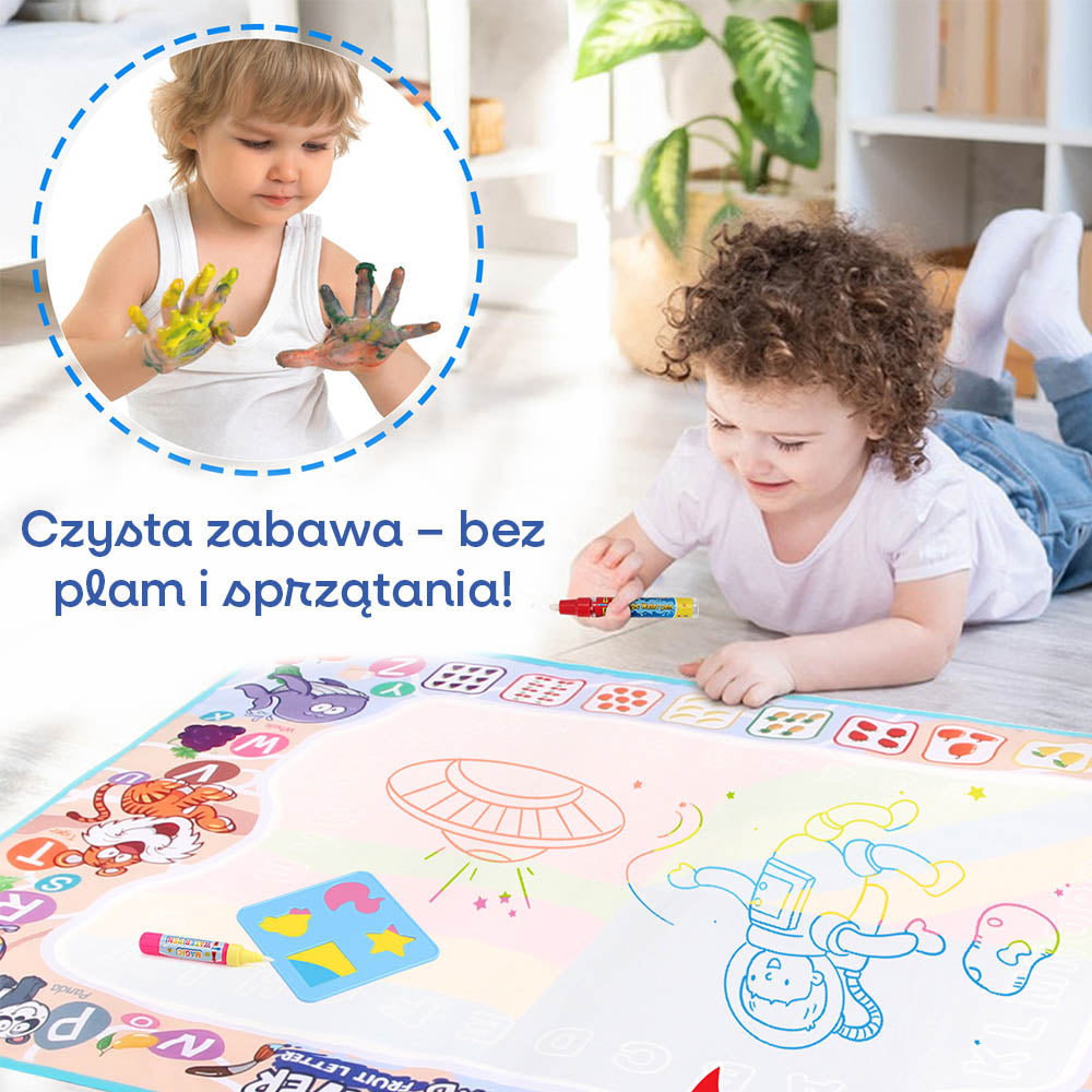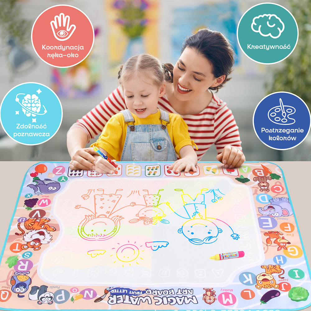 Magiczna Mata Wodna – Zabawa bez Bałaganu! Dziecko napełnia pisak czystą wodą i rysuje po specjalnej powierzchni maty. Po zetknięciu z wodą pojawiają się kolorowe wzory i obrazki, które po kilku minutach znikają. Bez plam, farb i papieru – tylko czysta, kreatywna zabawa!