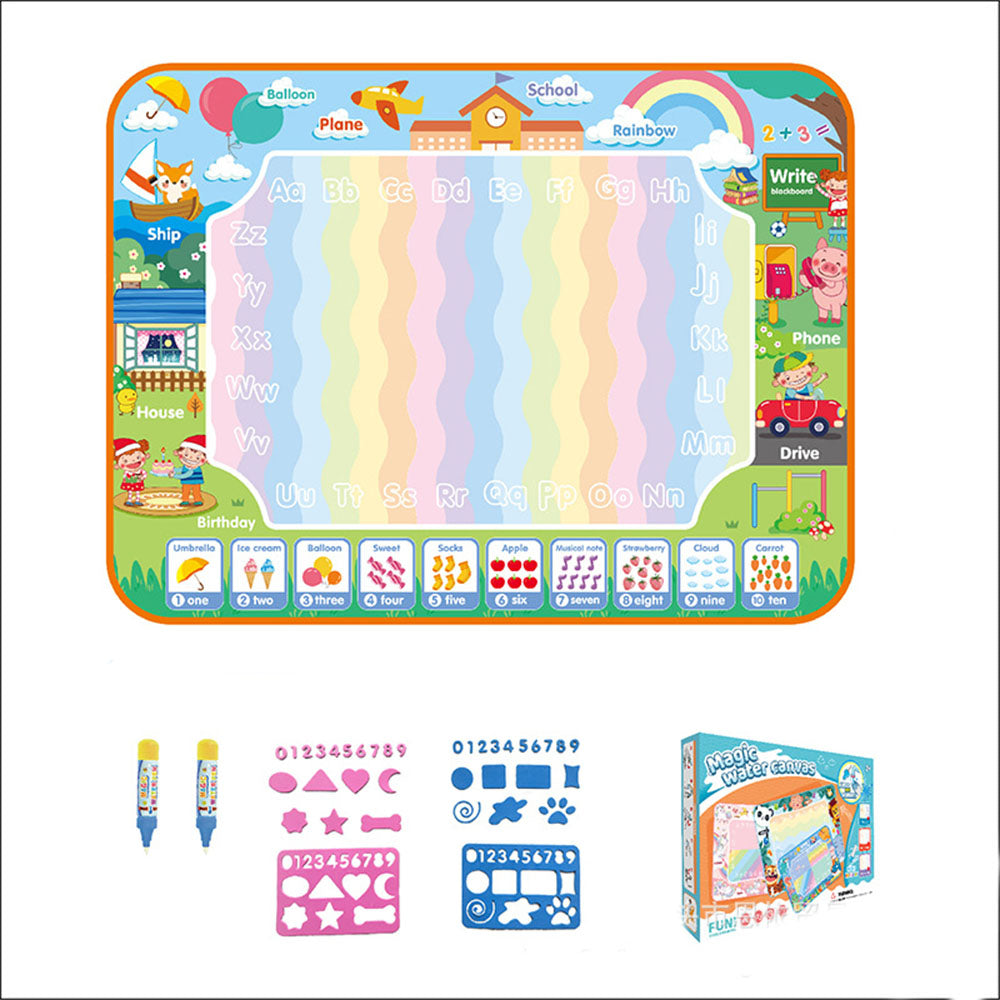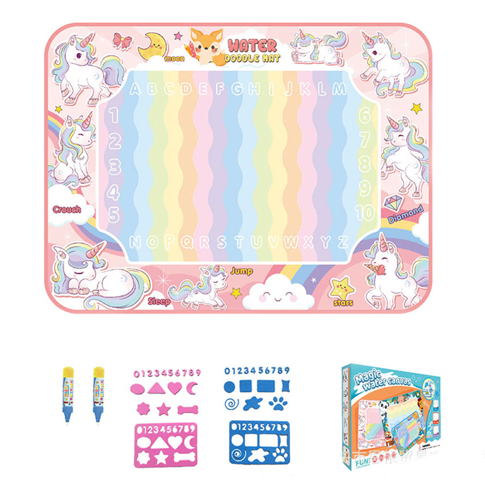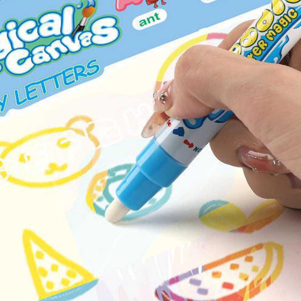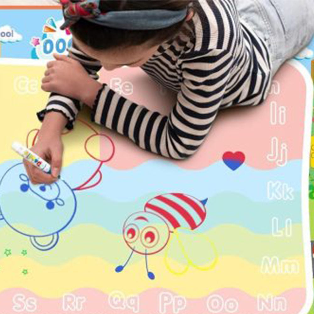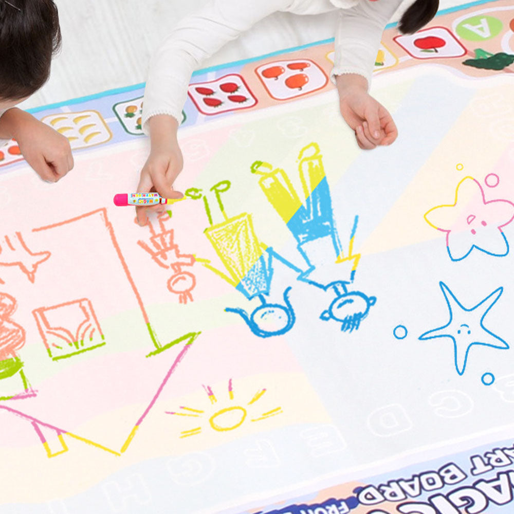 Magiczna Mata Wodna – Zabawa bez Bałaganu! Dziecko napełnia pisak czystą wodą i rysuje po specjalnej powierzchni maty. Po zetknięciu z wodą pojawiają się kolorowe wzory i obrazki, które po kilku minutach znikają. Bez plam, farb i papieru – tylko czysta, kreatywna zabawa!