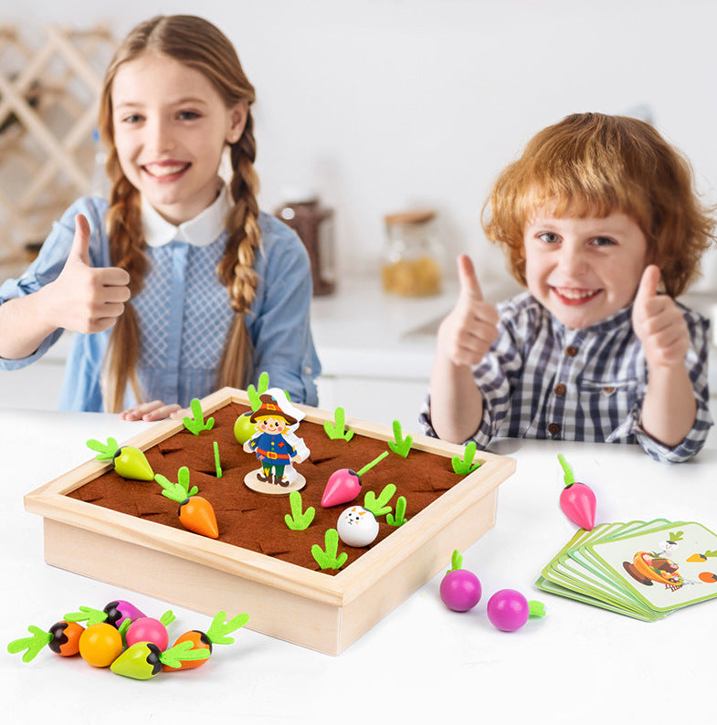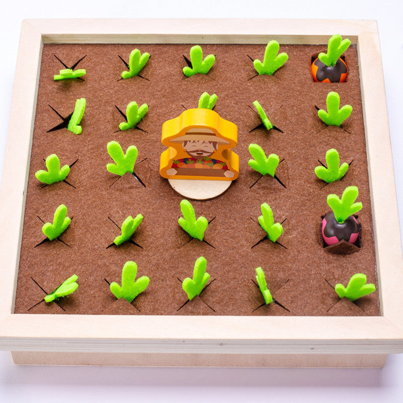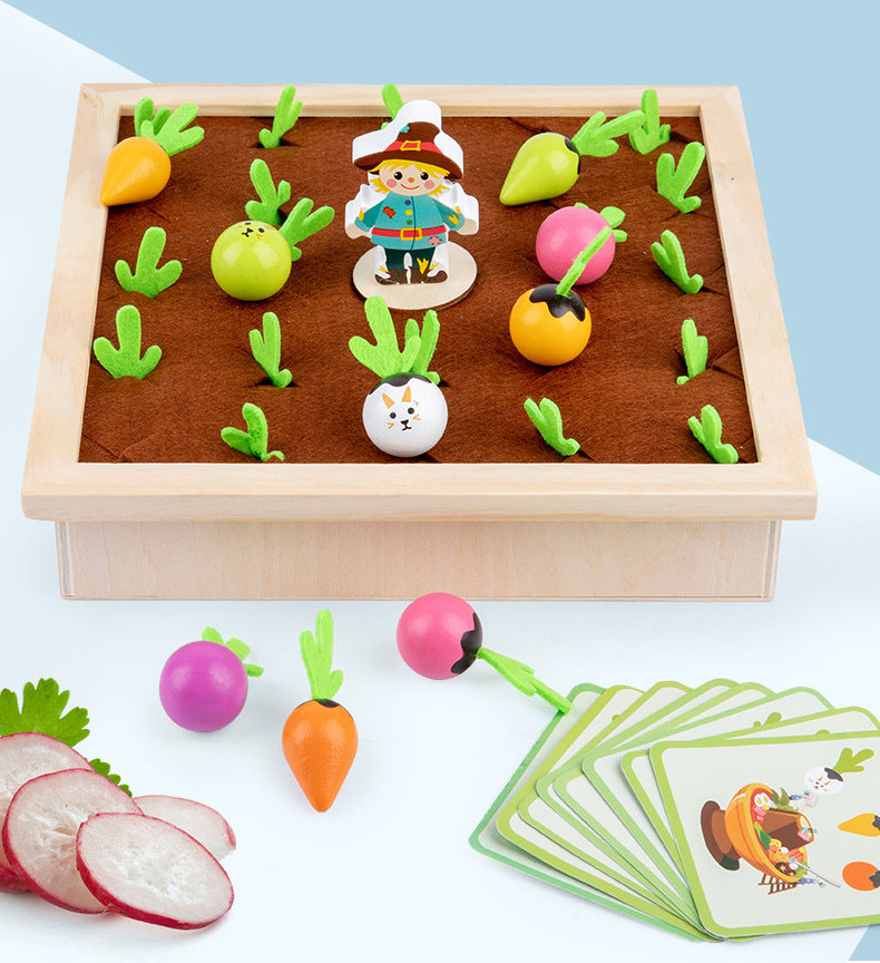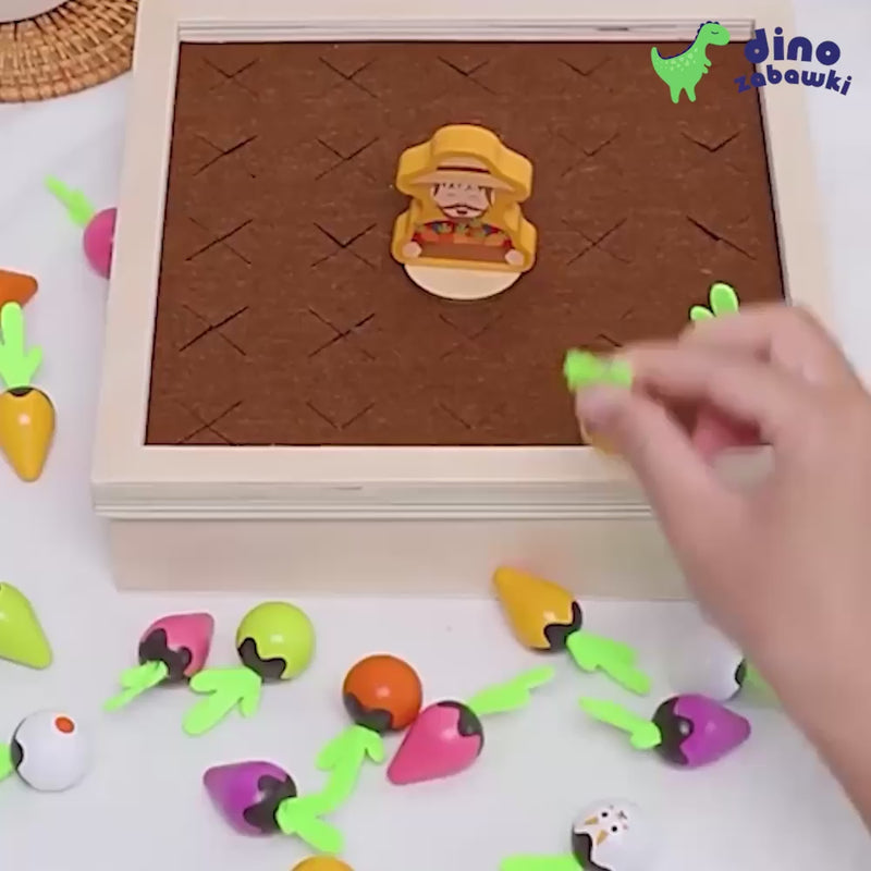 drewniana gra zaprasza dzieci do zabawy w małego ogrodnika. Dziecko losuje kartę, a jego zadaniem jest odnalezienie na grządce warzywa o takim samym kolorze i kształcie. Wyciąganie warzywek z miękkimi filcowymi listkami wspiera motorykę, koncentrację i spostrzegawczość.