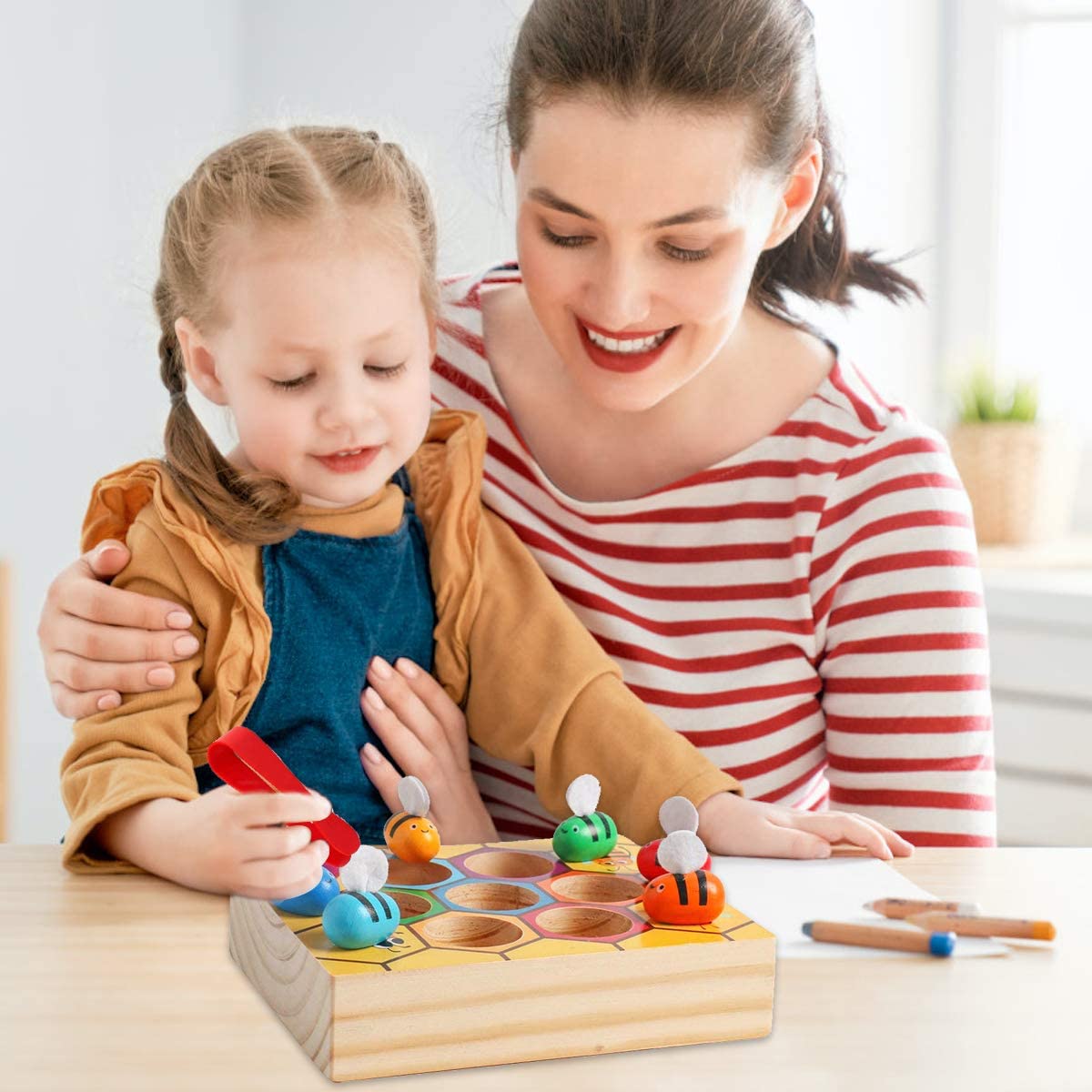 Dodatkowo dziecko uczy się rozpoznawania i dopasowywania kolorów, a także rozwija koncentrację, cierpliwość i umiejętność logicznego myślenia podczas dopasowywania pszczółek do ich "domków".