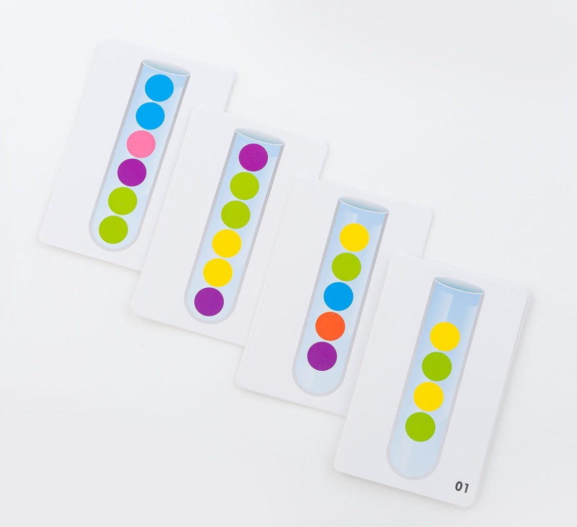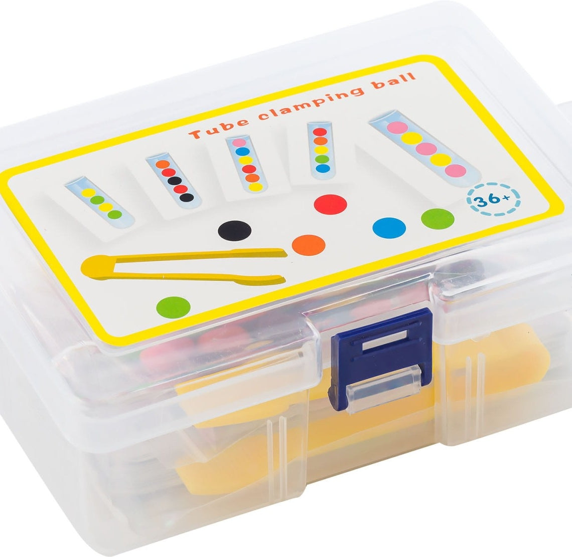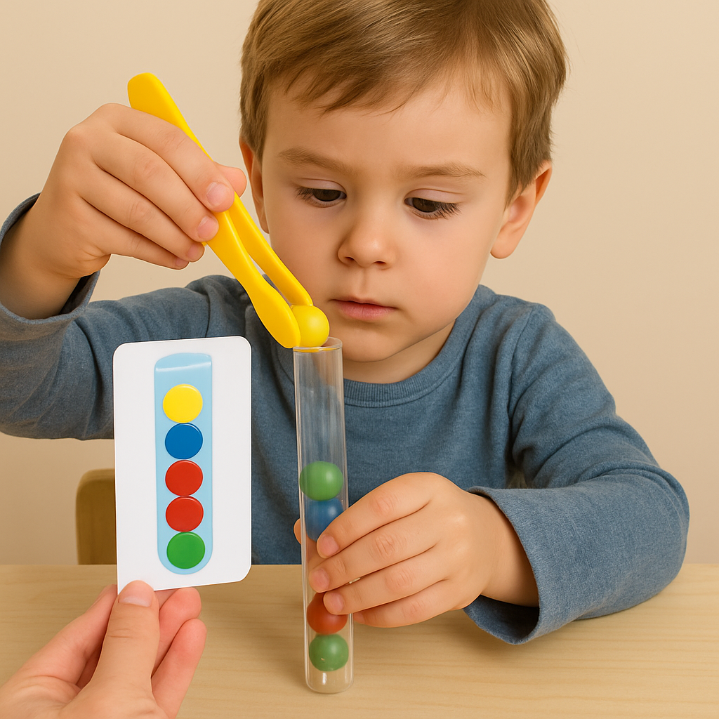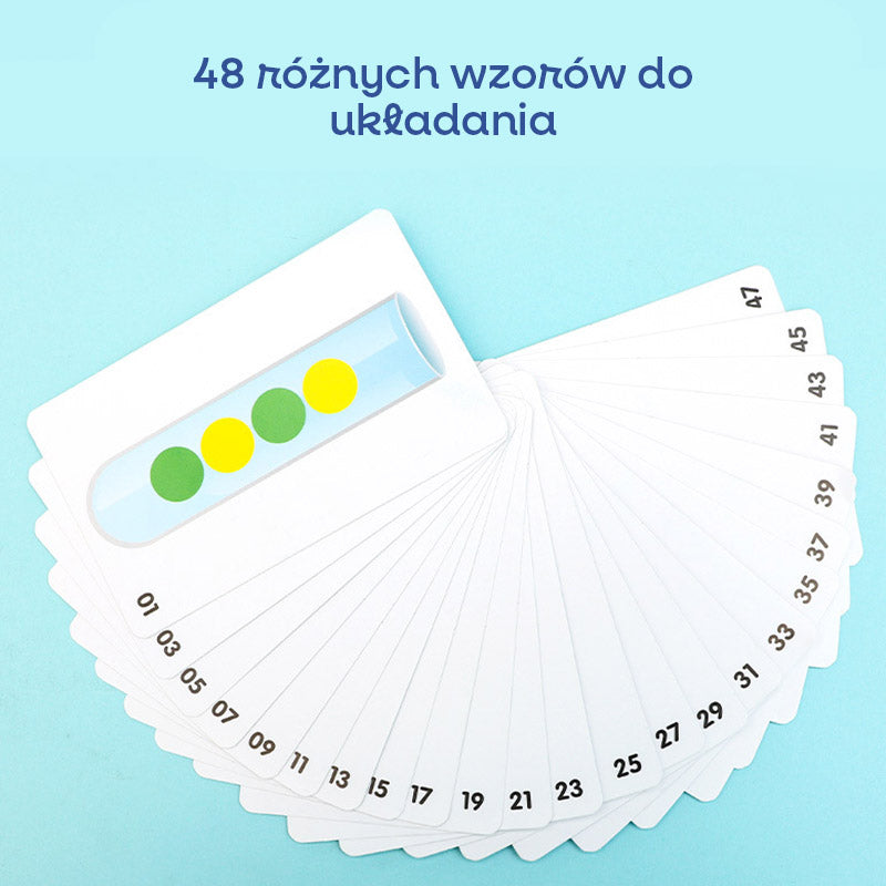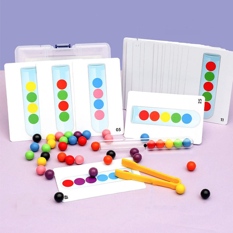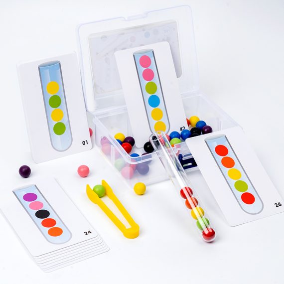 Zabawka polega na odtwarzaniu wzorów z kart za pomocą kolorowych kulek, plastikowej próbówki i szczypiec. Dziecko losuje kartę z układem kulek w probówce i stara się odwzorować ten sam układ, używając do tego dołączonych kulek i narzędzi. Świetna jako pomoc dydaktyczna do nauki przez zabawę w stylu Montessori – w domu, przedszkolu lub gabinecie terapeutycznym.