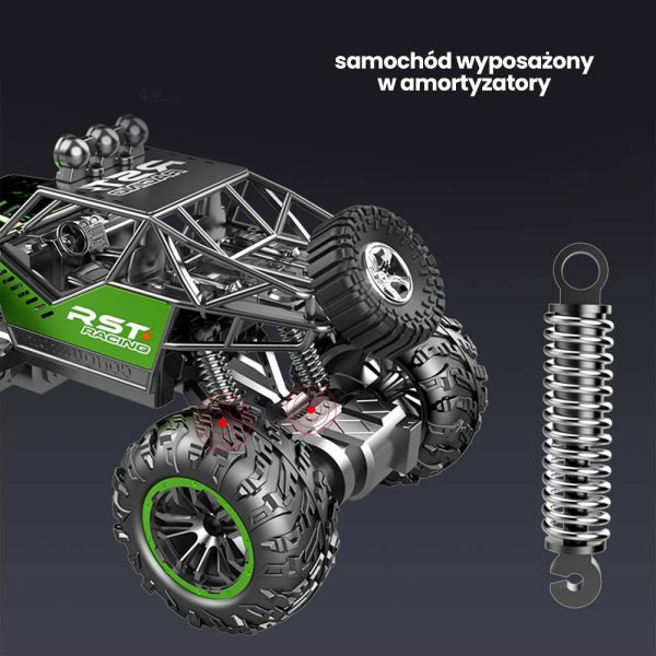 Samochód został wyposażony w mocne, sprężynowe amortyzatory, które skutecznie tłumią wstrząsy i drgania podczas jazdy po nierównym terenie. Dzięki nim pojazd stabilnie pokonuje przeszkody, utrzymuje przyczepność na zakrętach i nie traci kontroli nawet na kamieniach, piachu czy trawie.
