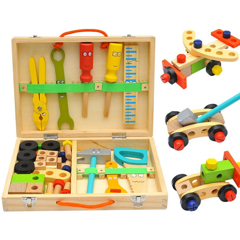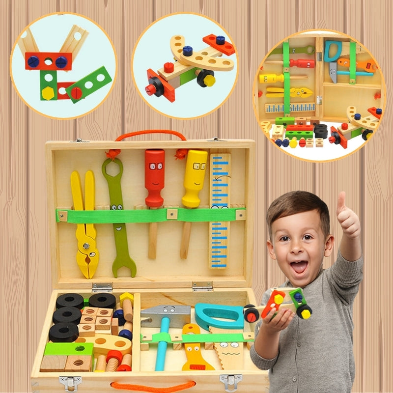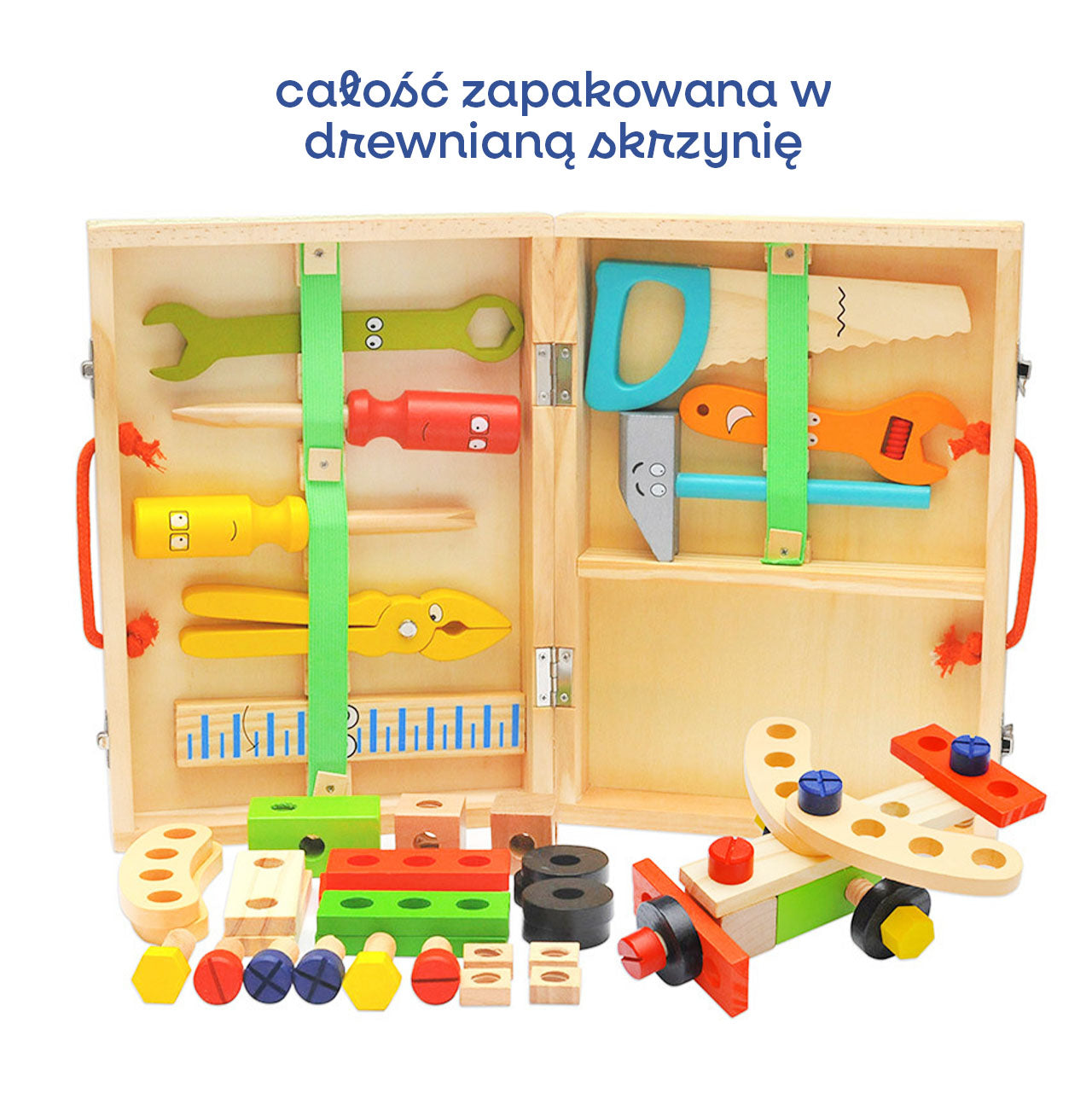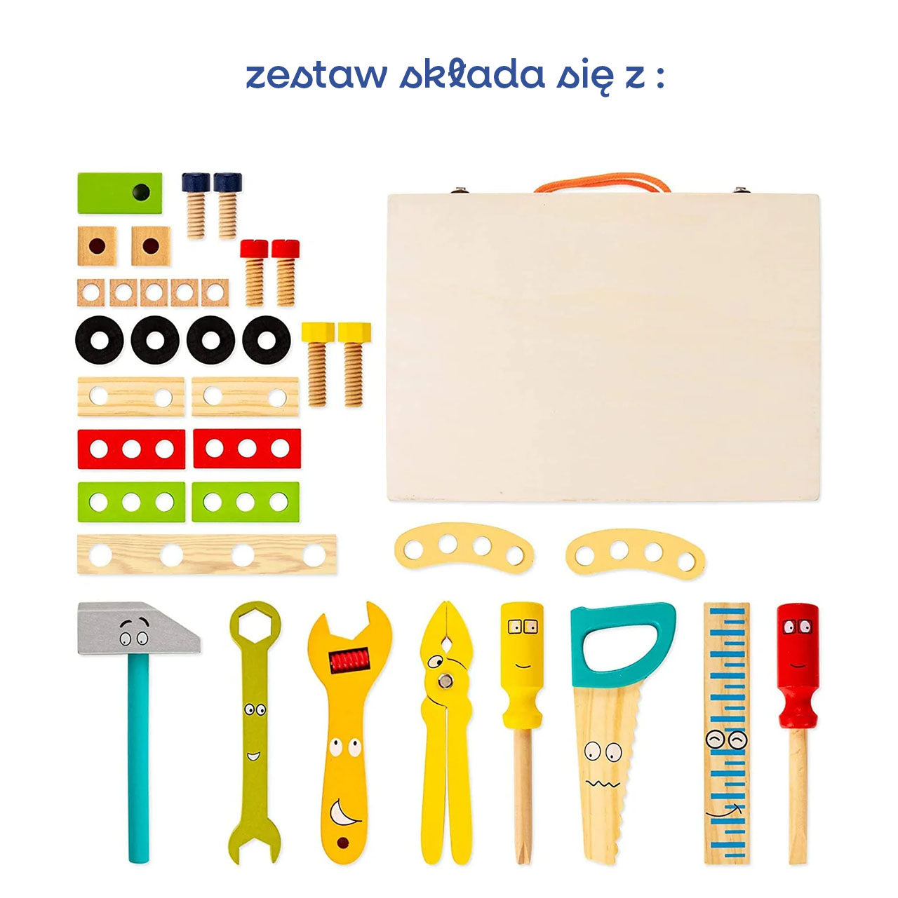 Zestaw narzędziowy dla dzieci to drewniana walizka pełna kolorowych, realistycznych narzędzi — młotka, śrubokrętów, klucza, kombinerek, linijki oraz śrubek i elementów do skręcania. Wesołe buźki na narzędziach od razu zachęcają do zabawy. Dziecko może skręcać i budować własne konstrukcje, a poręczna walizka pozwala zabrać zestaw wszędzie.