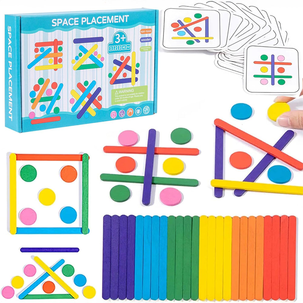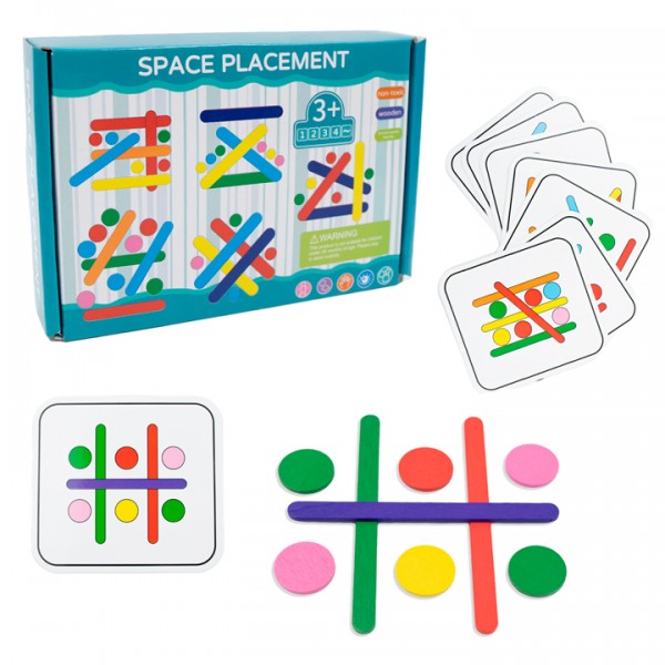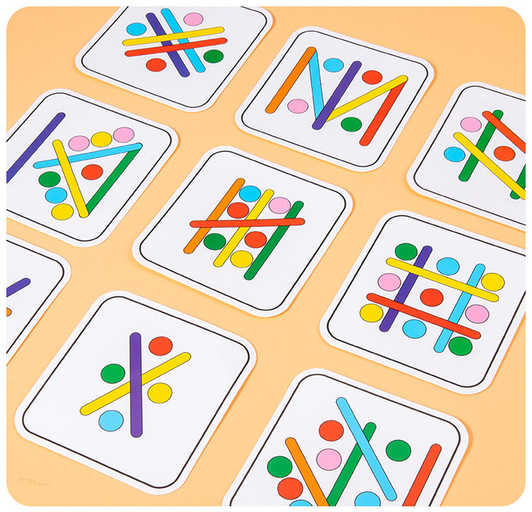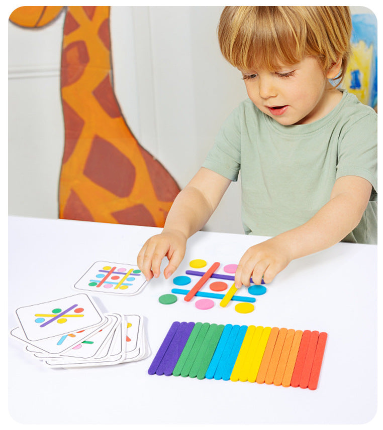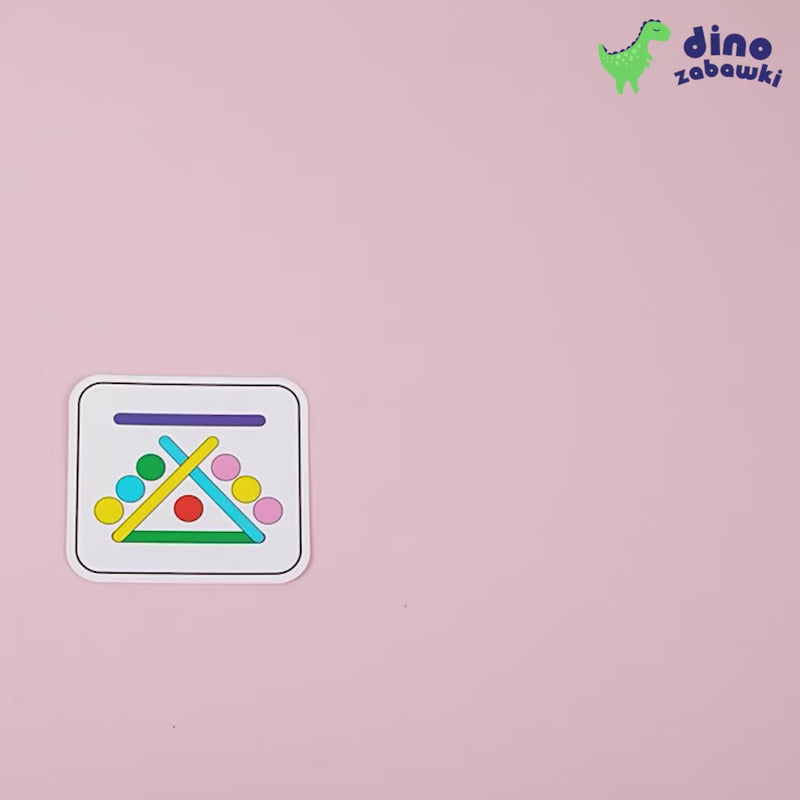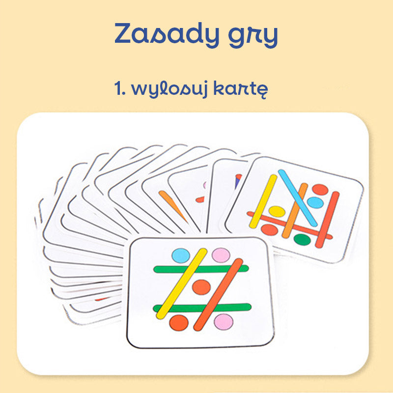 Ta kolorowa gra edukacyjna to świetna zabawa rozwijająca logiczne myślenie, koncentrację oraz motorykę małą u dzieci. Zadaniem dziecka jest odtworzenie wzorów z kart za pomocą drewnianych patyczków i kolorowych krążków. Każda karta przedstawia inny układ elementów, który trzeba dokładnie odwzorować, dopasowując kolory, pozycje i kolejność warstw.