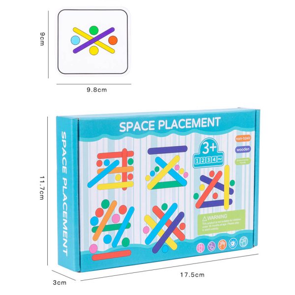 Zestaw zapakowany jest w poręczne pudełko o wymiarach 17,5 × 11,7 × 3 cm, co czyni go idealnym do przechowywania i zabierania w podróż. W środku znajduje się komplet kolorowych drewnianych patyczków i krążków oraz karty wzorów o wymiarach 9,8 × 9 cm, na których przedstawione są układy do odwzorowania.