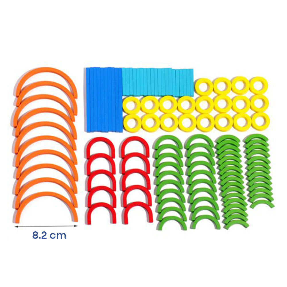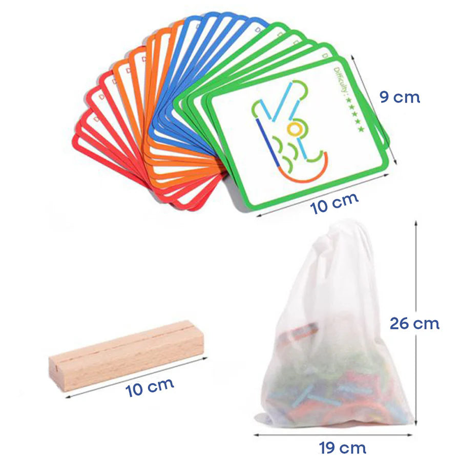 Zestaw zawiera 140 elementów, które rozwijają kreatywność i umiejętności dziecka. W środku znajdziesz 20 dwustronnych kart (10 × 9 cm) z różnorodnymi wzorami – literami, pojazdami, przedmiotami i zwierzątkami. Do ich odwzorowywania służy 120 kolorowych drewnianych elementów w różnych kształtach: patyczki, kółka i łuki w trzech rozmiarach. Wszystkie są gładkie, oszlifowane i pomalowane bezpiecznymi farbami, dzięki czemu są w pełni bezpieczne dla dzieci.