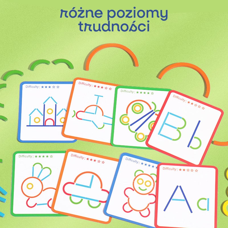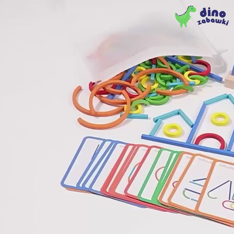 Zestaw Sticks and Rings to kreatywna układanka, która uczy dzieci poprzez działanie i odkrywanie. Kolorowe patyczki, kółka i łuki pozwalają odtwarzać ilustracje z kart – od prostych kształtów po litery, liczby, pojazdy i bardziej złożone wzory. Różne poziomy trudności sprawiają, że zabawa rośnie razem z dzieckiem.