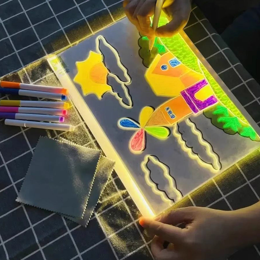Podaruj dziecku magię rysowania na podświetlanej tablicy LED! Przezroczysta powierzchnia po zetknięciu z markerami zamienia się w świecący, neonowy obrazek. To idealny sposób na rozwijanie wyobraźni, naukę rysunku i tworzenie własnych świecących dekoracji. Tablica jest wielokrotnego użytku — wystarczy przetrzeć i można zaczynać od nowa!