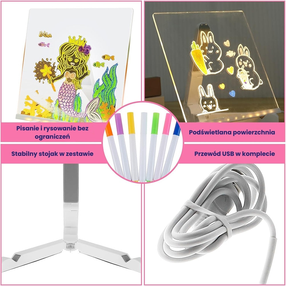 Rozbudź kreatywność dziecka dzięki podświetlanej tablicy LED! Przezroczysta akrylowa płytka świeci po narysowaniu wzoru, tworząc efekt neonowego światła. W zestawie znajdują się kolorowe markery fluorescencyjne oraz stabilna podstawka.