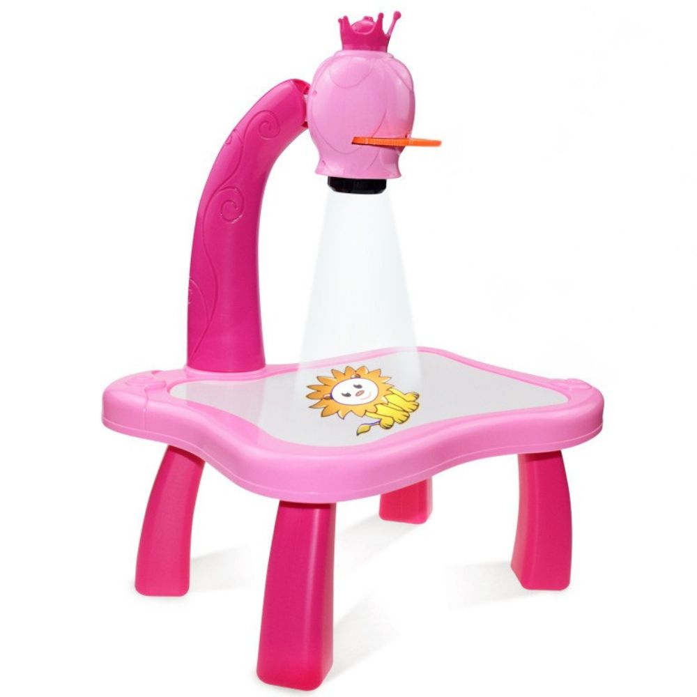 Na górze stolika znajduje się projektor w kształcie zabawnego zwierzątka lub księżniczki. Wystarczy włożyć do niego jedną z kolorowych tarcz z ilustracjami, a obrazek zostanie wyświetlony bezpośrednio na powierzchni stolika. Dziecko może łatwo odrysować kontury i następnie pokolorować je według własnego pomysłu – to jak zabawa w kalce, ale o wiele bardziej ekscytująca!