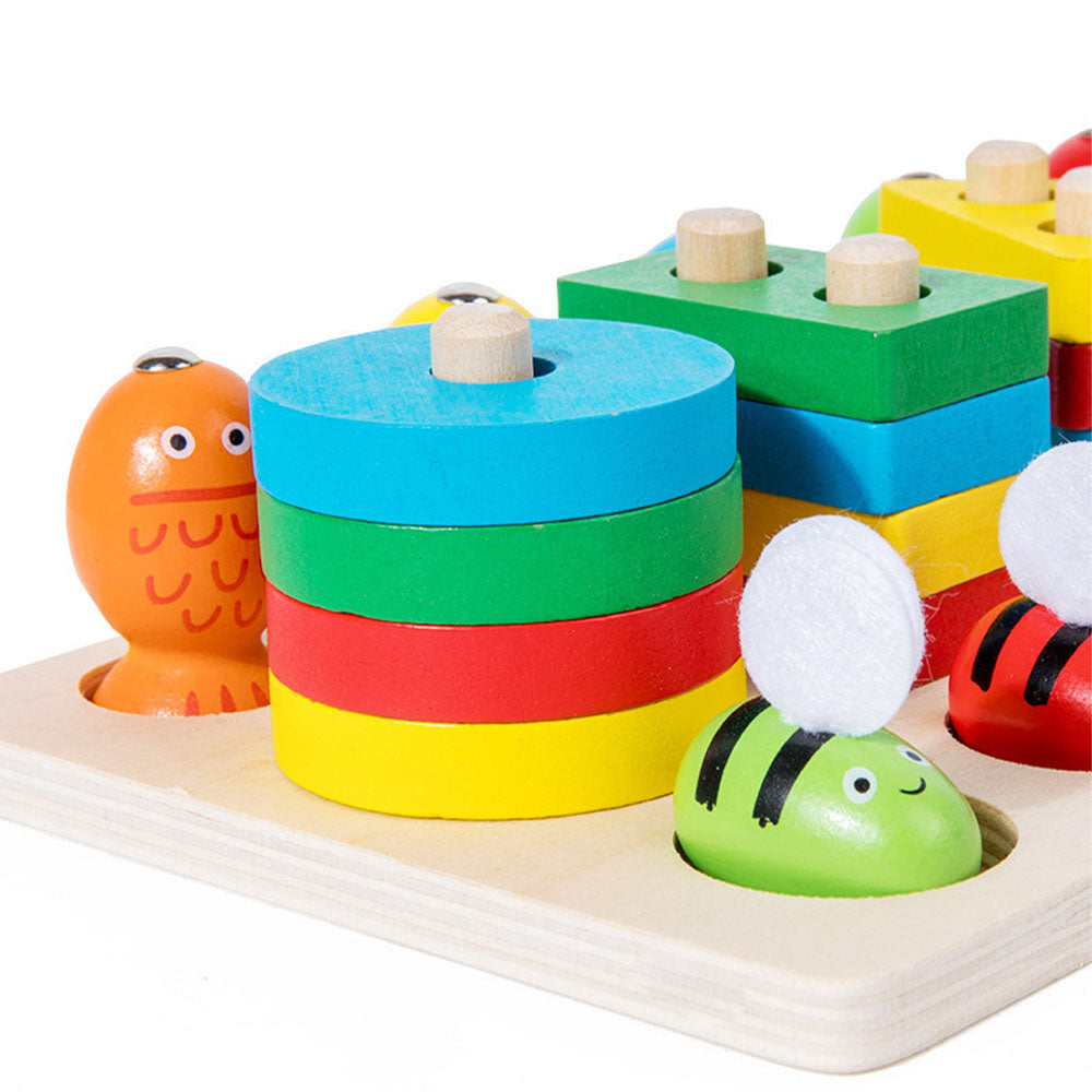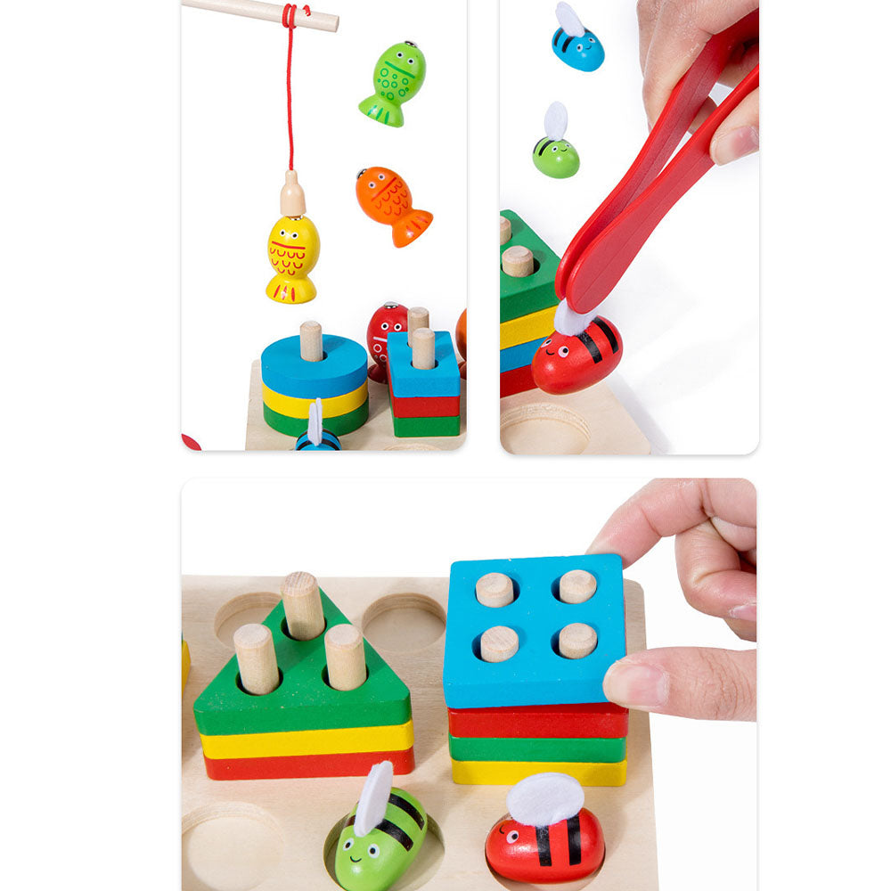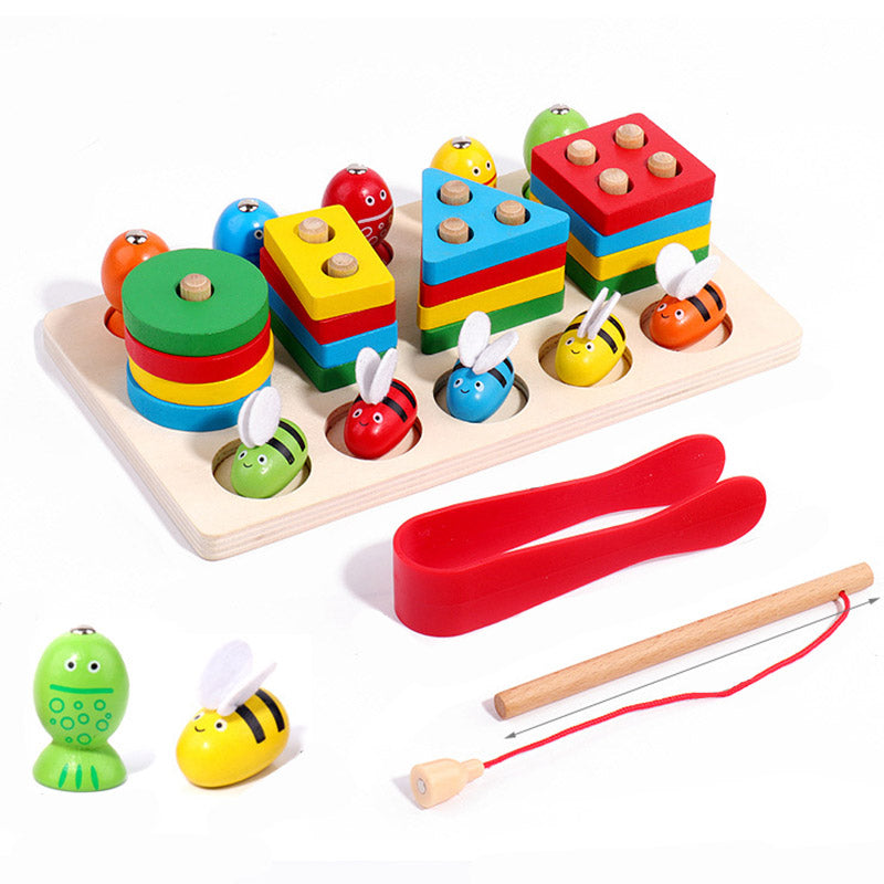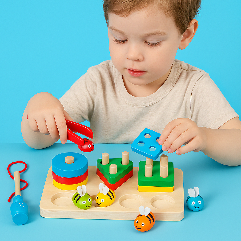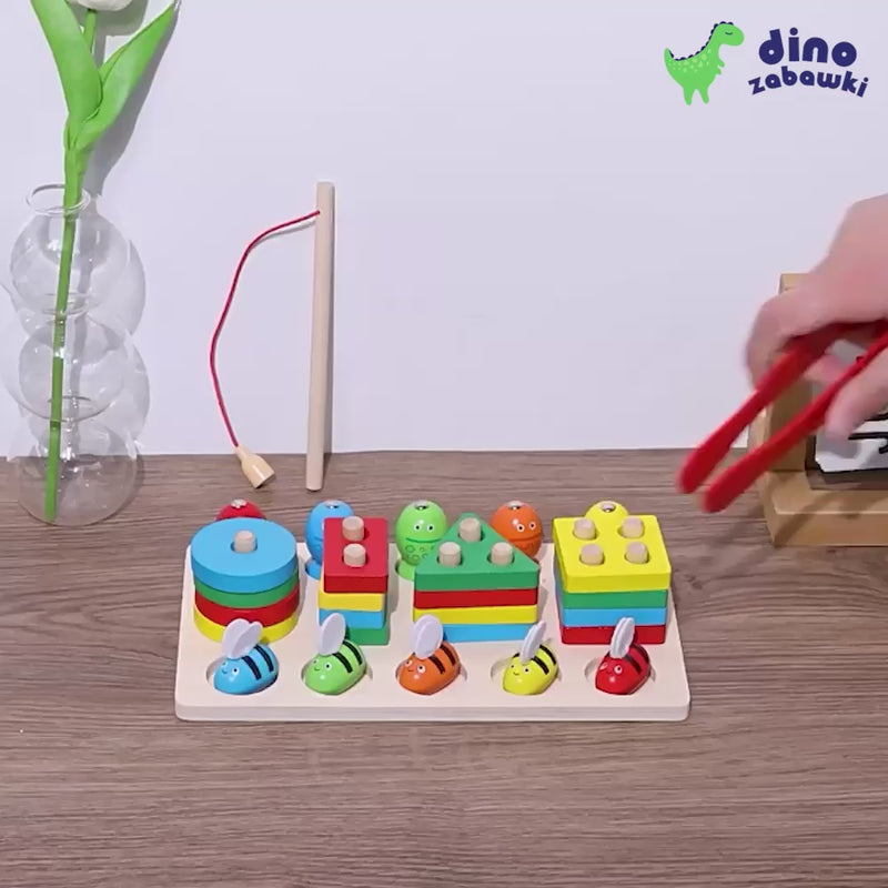 Ta kolorowa drewniana zabawka edukacyjna to idealne połączenie nauki i zabawy! Zawiera trzy aktywności w jednym zestawie: dopasowywanie kształtów, łowienie pszczółek na magnes oraz sortowanie kolorowych figur. W zestawie znajdują się: kolorowe klocki geometryczne, drewniane pszczółki z magnesem, pęseta, wędka oraz solidna plansza z miejscami do dopasowania.