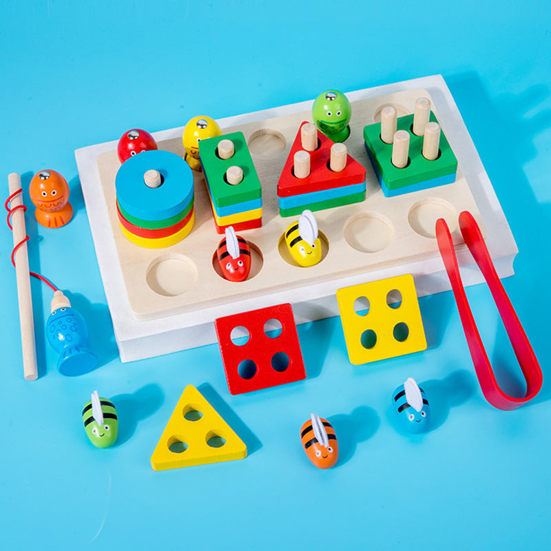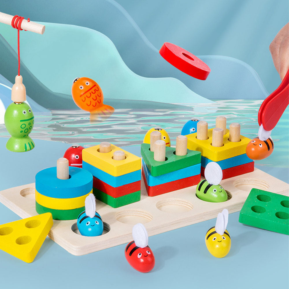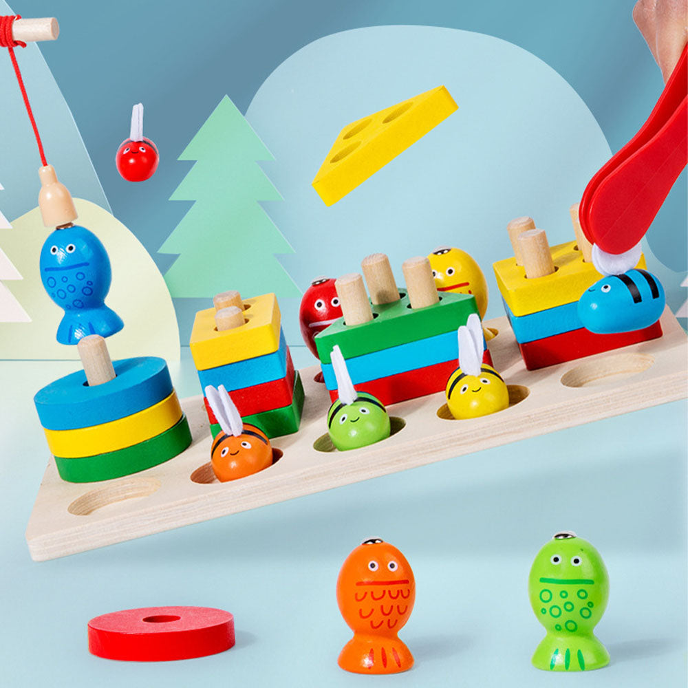 Zestaw składa się z solidnej drewnianej podstawy (22,5 × 13 × 5,3 cm), kolorowych klocków w różnych kształtach, 5 pszczółek (ok. 3 × 3 cm), 5 rybek do łowienia (4 × 2,5 cm), wędki magnetycznej (13 cm) oraz pęsety (12 × 3 cm). Wszystkie elementy zostały wykonane z bezpiecznego, gładko szlifowanego drewna, pomalowanego nietoksycznymi farbami, dzięki czemu są całkowicie bezpieczne dla dzieci. Idealny zestaw do nauki, rozwoju i zabawy w jednym! Zabawka powyżej 3 roku życia.