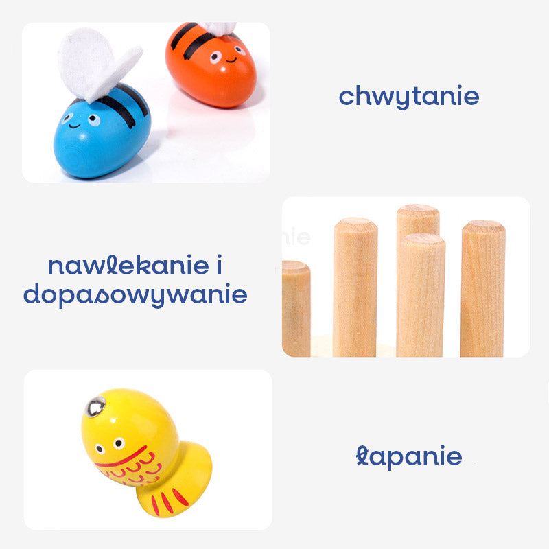 Zabawka oferuje dwie ekscytujące aktywności: dziecko może łowić rybki na wędkę z magnesem oraz chwytać pszczółki pęsetą, ćwicząc precyzję i koordynację ruchową. Te proste, ale angażujące zadania. Idealna zabawa, która wspiera rozwój dziecka każdego dnia!