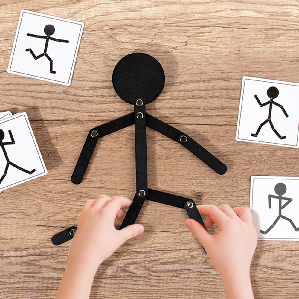 Drewniany Człowiek to kreatywna zabawka edukacyjna, która rozwija wyobraźnię, logiczne myślenie i zdolności manualne. Zadaniem dziecka jest odwzorowanie pozy z kart wzorcowych, ustawiając ruchome elementy figurki tak, aby jak najwierniej dopasować ją do ilustracji.