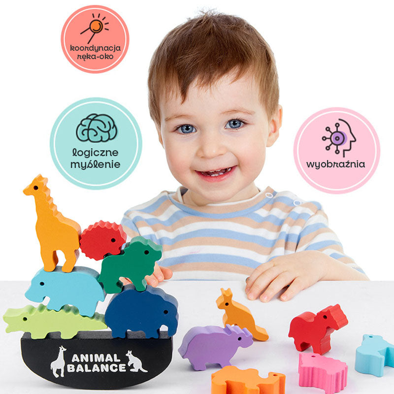 Zwierzaki Balansujące to kolorowa gra zręcznościowa, w której dzieci układają drewniane figurki zwierząt na półkolistej, kołyszącej się podstawie. Zadanie jest proste tylko z pozoru — konstrukcja nie może się przewrócić! Dzieci mogą testować różne ustawienia i kombinacje. To świetna zabawa pełna emocji i śmiechu.