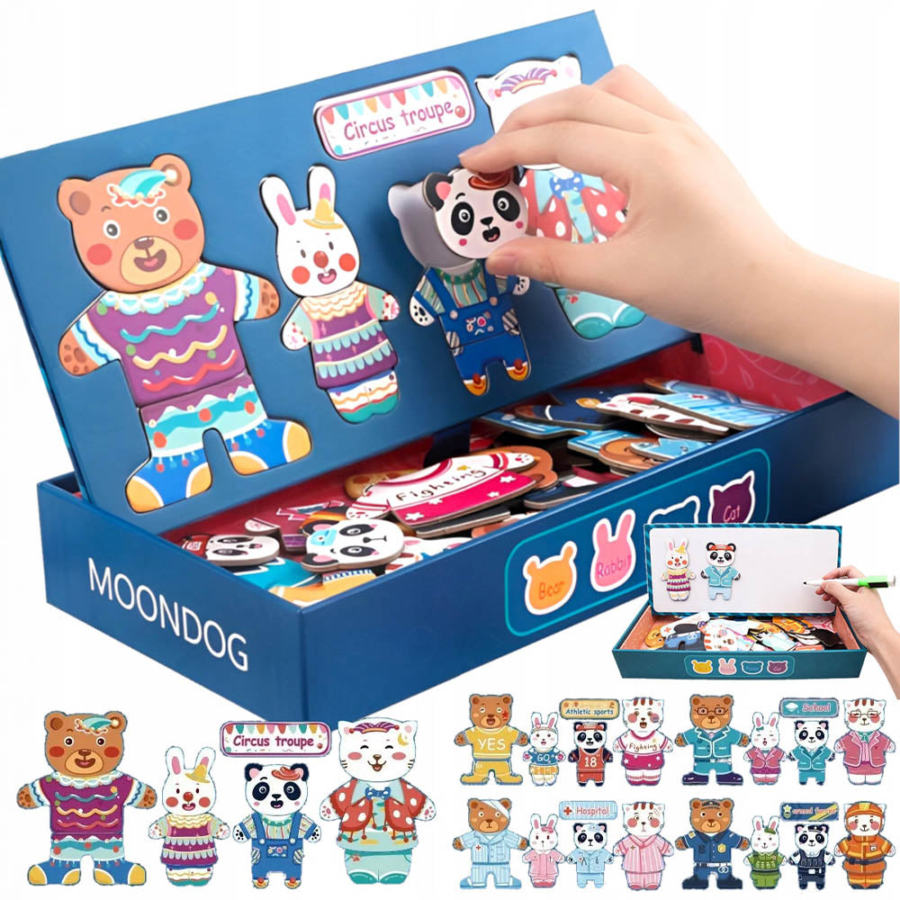 Magnetyczna układanka to kreatywna zabawka, dzięki której dzieci mogą tworzyć sportowe stylizacje dla misia, królika, pandy i kota, korzystając z magnetycznych ubrań i akcesoriów. Dodatkowym atutem zestawu jest tablica do rysowania oraz pisak, dzięki którym dziecko może dorysowywać własne elementy, dekorować scenki lub tworzyć zupełnie nowe pomysły.